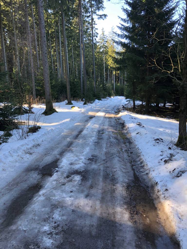 Ganz anders sah das in den Waldlagen des Erzgebirges aus. Nachdem es zwei bitterkalte Wochen mit Schnee und Temperaturen unter -20°C gegeben hatte, waren dort die Wege teils noch dick vereist. Streckenweise hatten wir Mühe uns auf den Beinen zu halten. Diesmal kamen wir auf rund 20 Kilometer und 320 Höhenmeter in gut 5h30. Langsam trägt sich der Rucksack auch etwas leichtfüßiger. Ich komme in den Fluss.