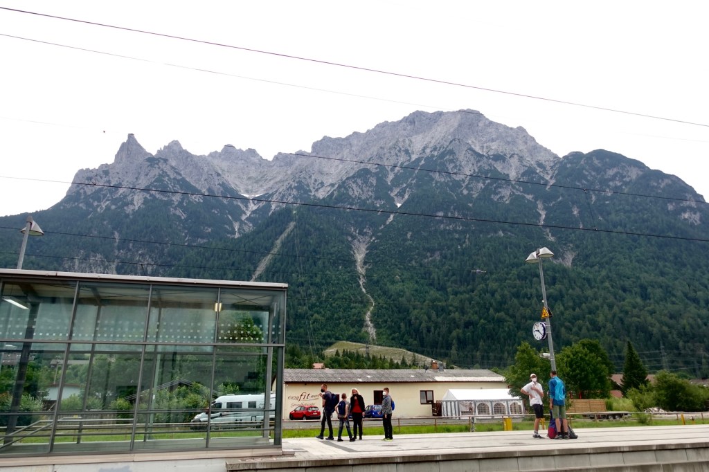 Mit dem Wanderbus geht es kostenlos bis nach Mittenwald. Dort steigen wir am Bahnhof in den Zug Richtung Seefeld. Es ist die wohl teuerste Kurzstrecke, die wir je gefahren sind. Über 13,-€ löhnen wir für eine Station. In Scharnitz angekommen, haben sich die Wolken zusammengezogen. Ein kräftiger Wind pfeift. Erste Tropfen nieseln auf uns, als wir aus dem Zug steigen. Das erste Mal packen wir unsere Regenmontur aus.