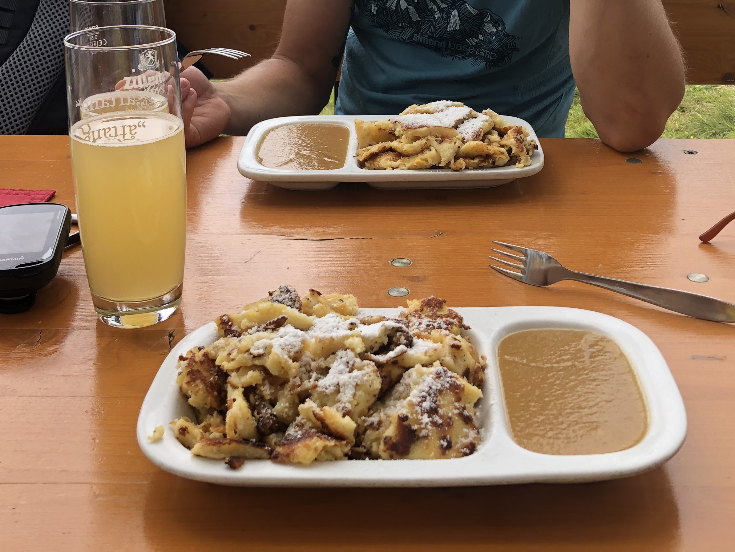 Der Wind hat wieder aufgefrischt, die Sonne ist verschwunden. 13.30 Uhr ist das Mittagsgeschäft noch in vollem Gange. Wir sollen uns erst setzen, später können wir einchecken. Also gönnen wir uns zwei Kaiserschmarren. Auf der überdachten Terrasse haben wir den perfekten Blick auf den Tuxer Gletscher. Wenig später treffen auch Armin und Johanna auf der Hütte ein. Kurz werten wir die heutige Tour aus, dann können wir endlich einchecken. Das erste Mal werden wir heute im Lager schlafen, da alle Zimmer bereits belegt sind. Die Hütte ist nicht mehr im besten Zustand, kein Vergleich zur Lizumer Hütte oder dem Hallerangerhaus. Die einzige Toilette befindet sich im Keller. Das Lager ist allerdings unter dem Dach. Weil es nur eine Dusche gibt, müssen wir Schlangestehen.