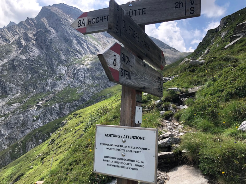 7.30 Uhr erreichen wir die erste und für uns an diesem Tag so verhängnisvolle Weggabelung. Auf dem Schild ist unser Weg – 8 Gliederscharte – ausgezeichnet. In die andere Richtung geht es Richtung Hochfeiler und auf die Hochfeilerhütte. Ein Zettel in Folie weist uns darauf hin, dass der Verbindungsweg „8A Gliederscharte“ gesperrt ist. ‚Shit!‘, denken wir. ‚Das ist bestimmt unser Weg. Aus der 8 wir nachher sicher die 8A. Hier können wir nicht laufen.‘ Ein folgenschwerer Trugschluss, der uns den Weg Richtung Hochfeiler nehmen lässt, im Glauben später wieder auf die Hauptroute zurückkehren zu können.