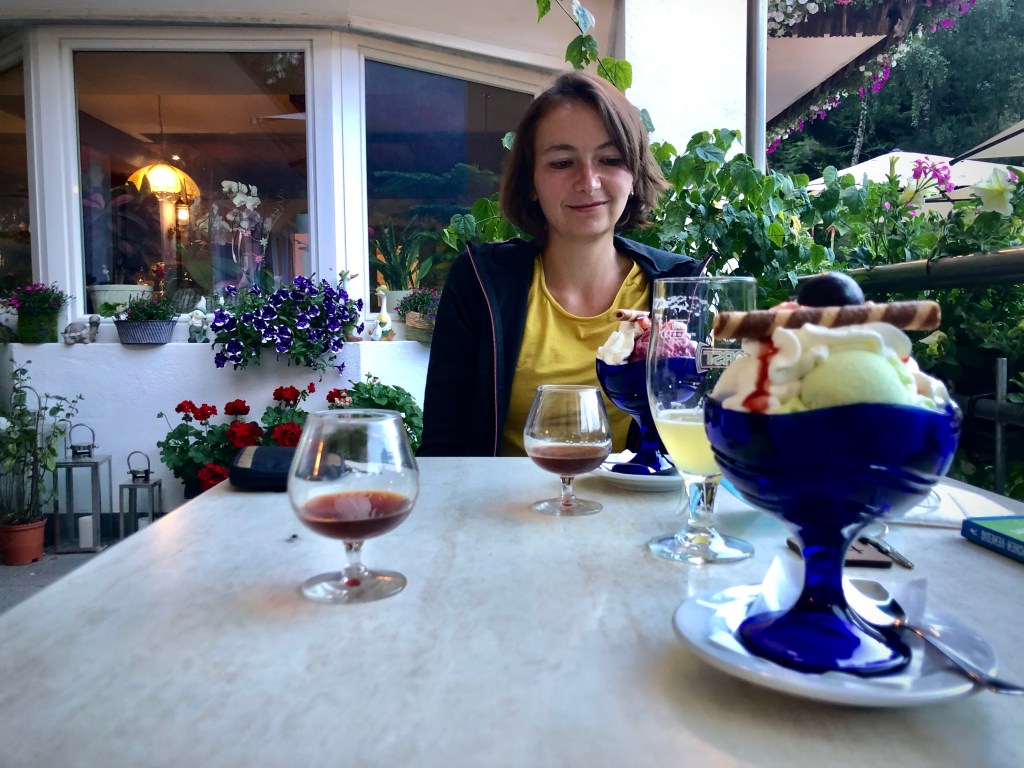 Zum Abendessen gönnen wir es uns dafür richtig. Nach einem zünftigen Rahmschnitzel schieben wir noch Eisbecher und Zirbenschnaps hinterher. Weil wir heute lieber allein an unserem Tisch bleiben, kommt Johanna aus dem Zweiergespann zu uns an den Tisch, um sich zu verabschieden. „Es war schön euch kennengelernt zu haben,“ sagt sie. „Und Danke für‘s Beibringen von Rommé.“ Während sie von ihrer Mutter abgeholt wird, kommt nun ihre große Schwester mit Freund zur Wandergruppe hinzu, um Armin bis Belluno zu begleiten. Auf dem Weg ins Bett schildern wir auch ihm noch knapp unsere ungewollte Hochfeilertour. „Ihr macht echt verrückte Sachen,“ meint er noch und wünscht uns eine gute Nacht.