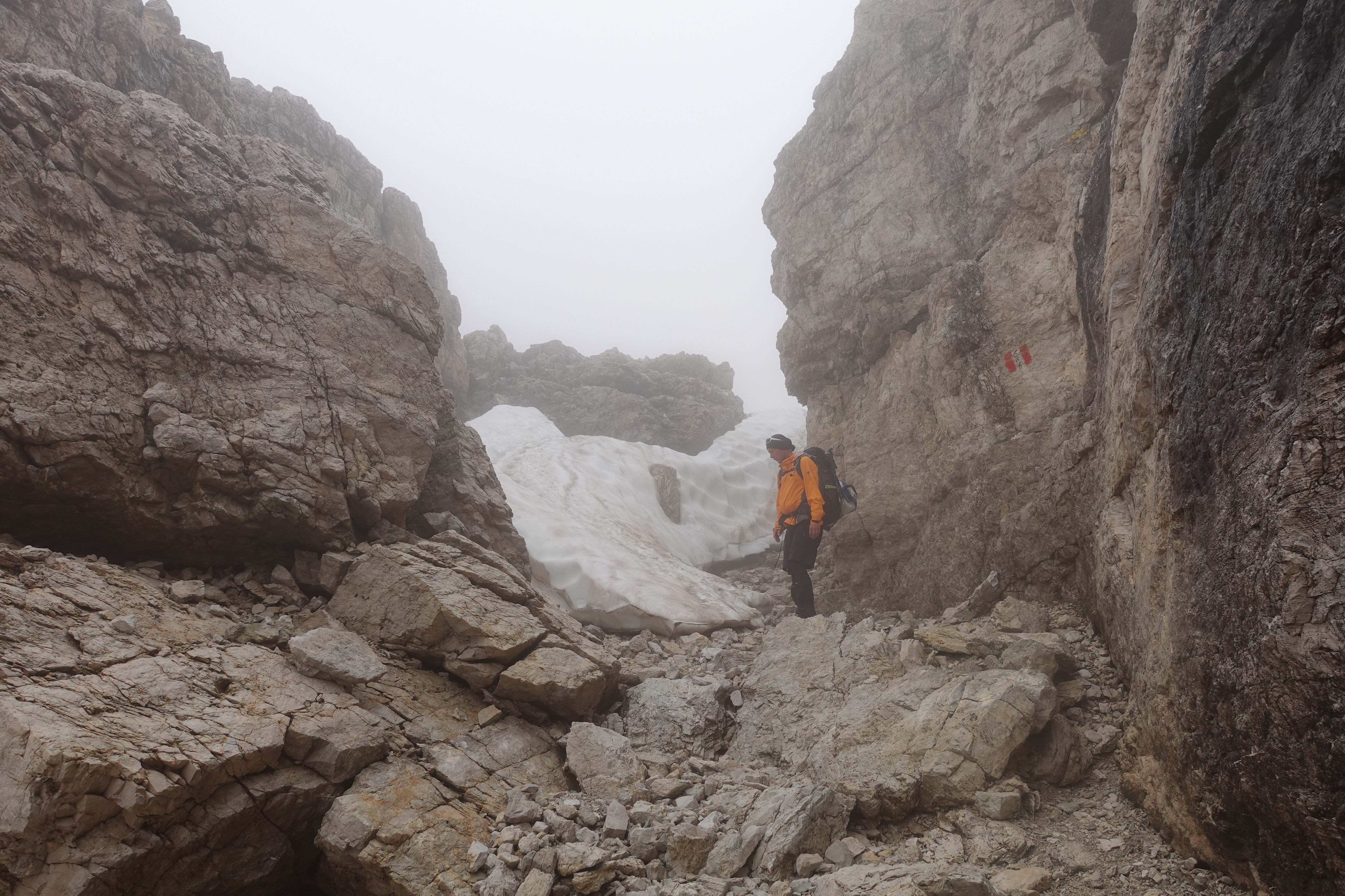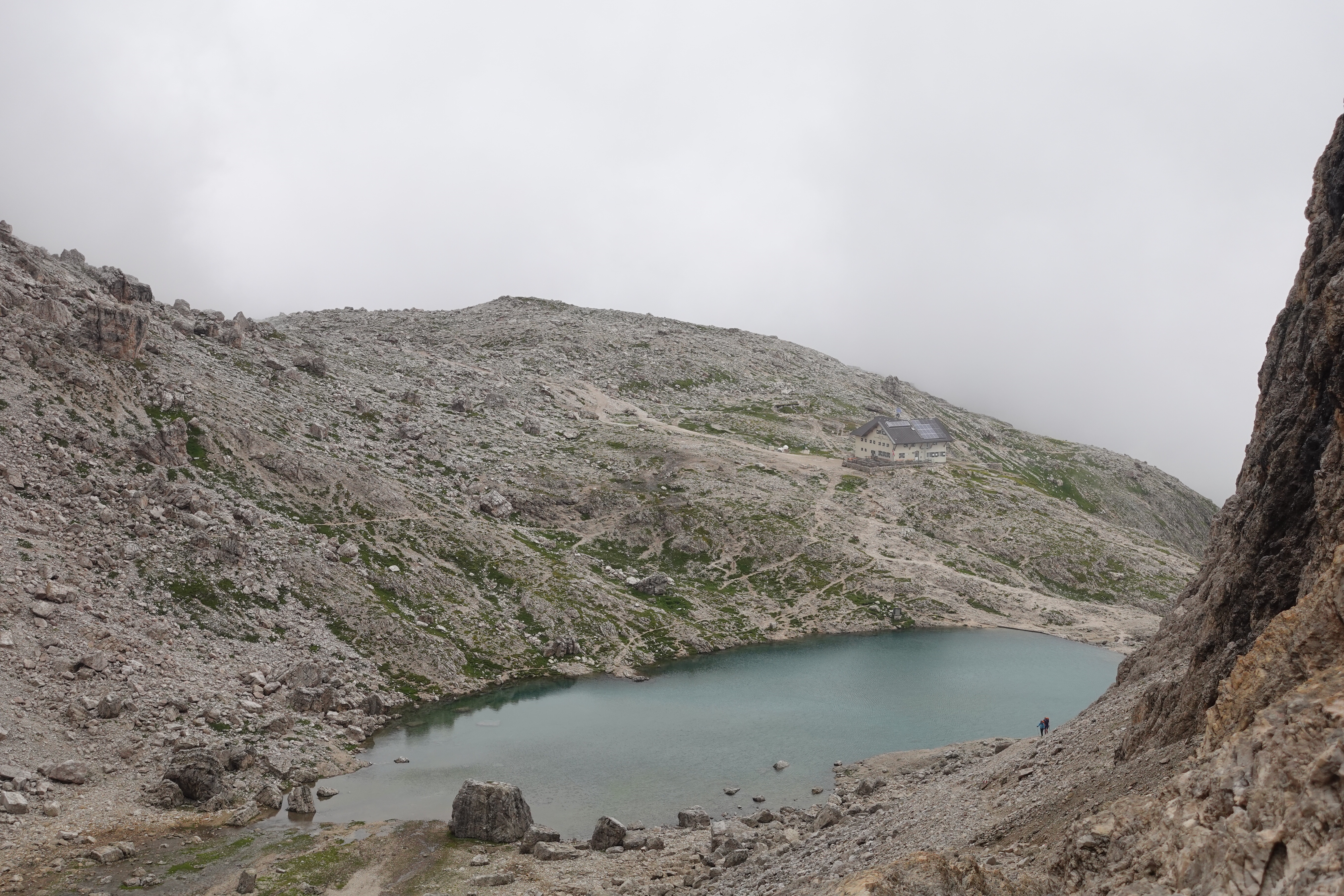 Aus dem Weg über Geröll und einige Schneefelder wird schließlich ein drahtseilversicherter Klettersteig mit Eisentreppen. Obwohl wir hier viel mehr klettern müssen als gestern, fühlt es sich mit Sicht und ohne Regen deutlich sicherer an. Oben erreichen wir das erste Sellaplateau mit dem Rifugio Pisciadù, das wir erst sehen als wir direkt davor stehen, so dicht hängen die Wolken am Himmel. Der Wind wird hier nun deutlich stärker. Als wir weiter aufsteigen, reißt die trübe Suppe um uns herum kurz auf und gibt den Blick auf den Pisciadùsee frei. Ähnlich wie der Friesenbergsee liegt er wie ein blaues Auge in der Steinwüste. Nach einem weiteren seilversicherten Kletterabschnitt wird es winterlich. Der Schnee steht übermannshoch in einer Felsscharte, die wir queren müssen. Sofort spüren wir die Kälte, die der verharschte Schnee ausstrahlt.