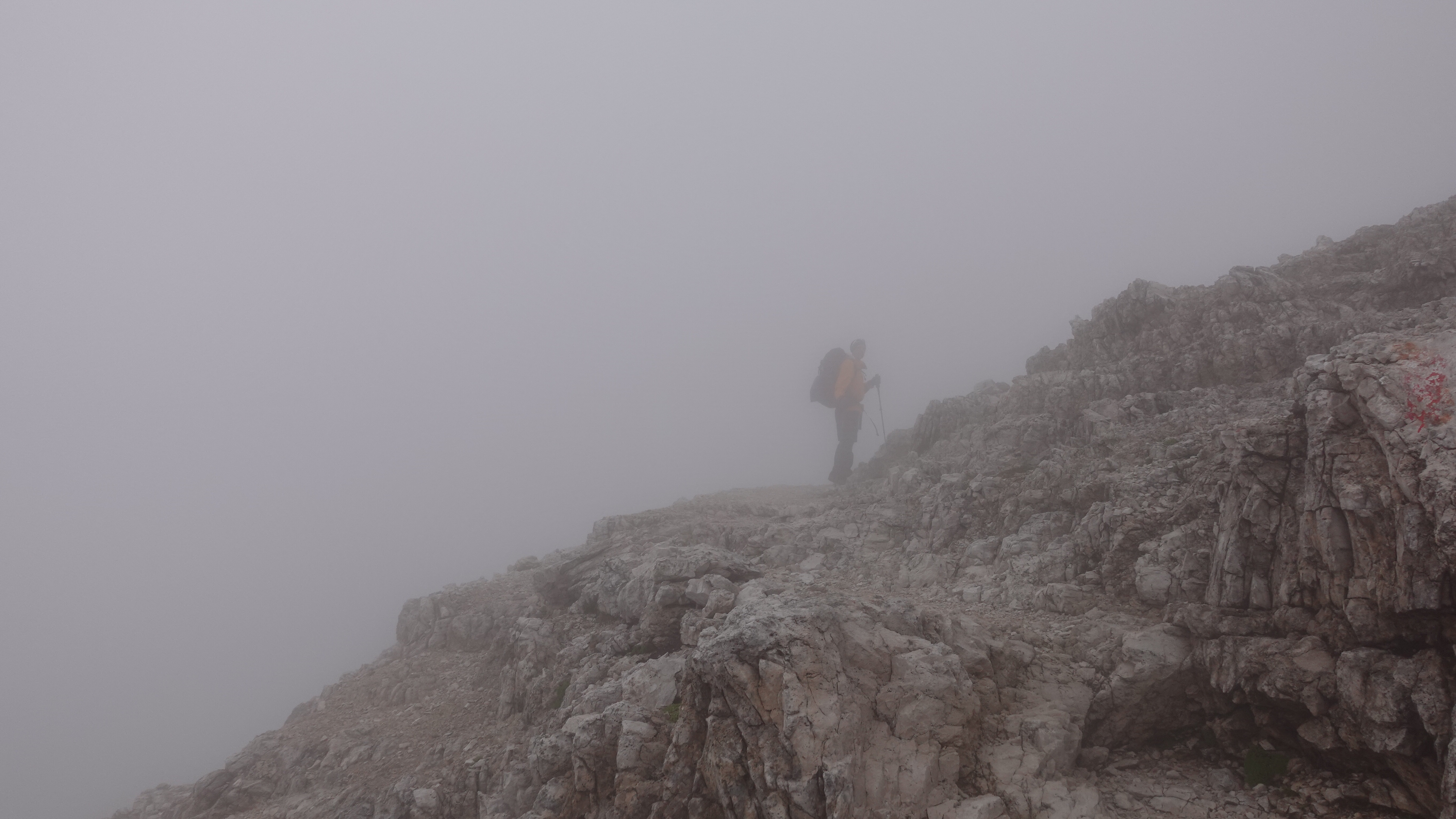 Im Nebel tasten wir uns nun von Felsplateau zu Felsplateau. Die Sichtweite fällt wieder einmal unter zehn Meter und wir sind froh, dass der Weg hier oben nicht nur durch farbige Markierungen, sondern auch durch Stangen gekennzeichnet wird. Ein letztes Mal überholen uns Heike und Lars als wir Rast machen. Sie drücken uns die Daumen, dass es mit dem Sonnenaufgang morgen früh auf dem Gipfel vielleicht doch noch klappt. Dann verschwinden sie wieder in den Wolken vor uns. Eine Weile hören wir noch ihre Stimmen von Weitem bis es wieder still wird.