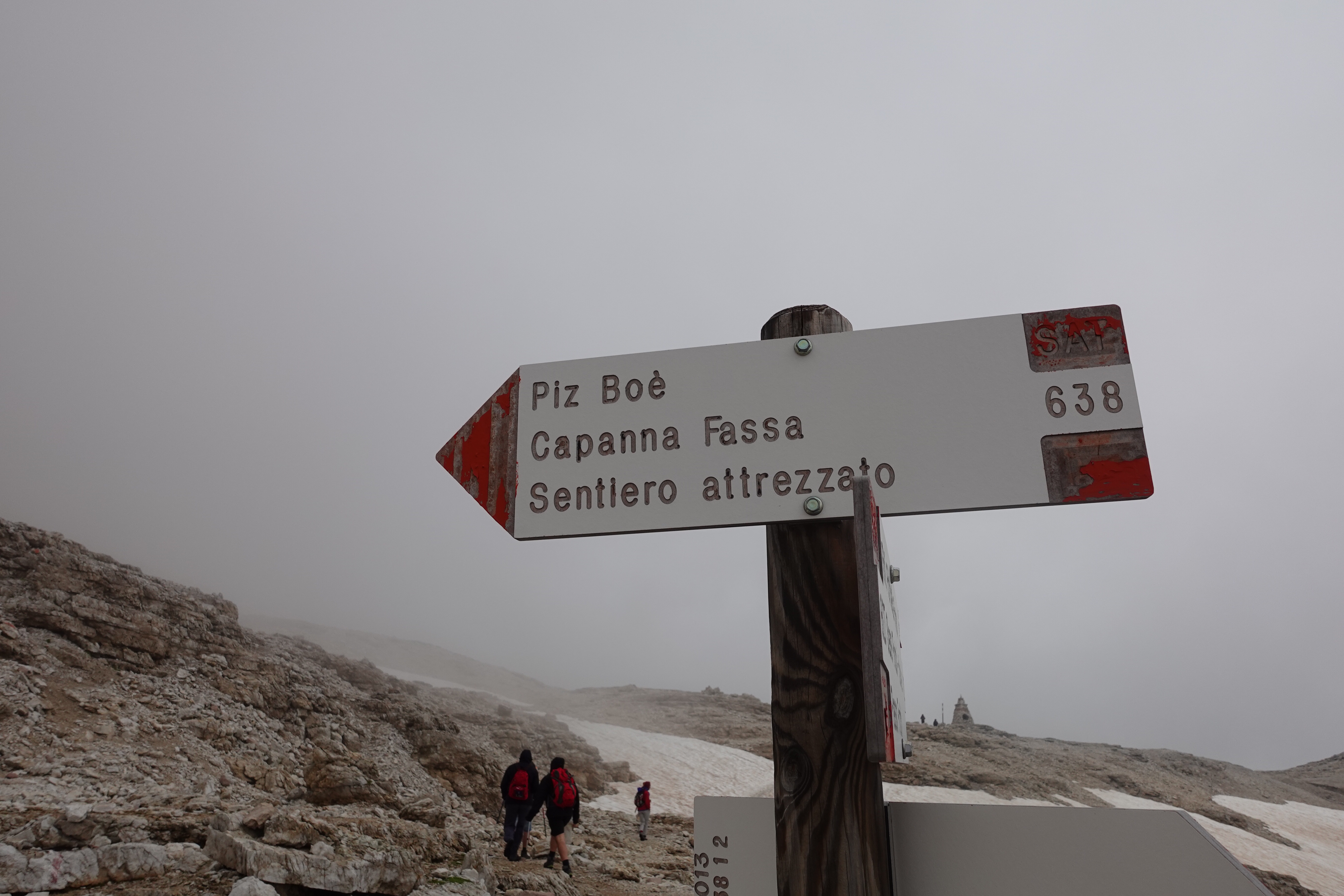 Als wir an der Boè-Hütte ankommen, wird das Wetter noch einmal deutlich ungemütlicher. Neben dem Wind kämpfen wir beim Aufstieg auf den Gipfel auch gegen immer stärkeren Regen an. Nur wenige Höhenmeter trennen uns noch vom Gipfel, als wir erneut vor einem drahtseilversicherten Klettersteig stehen. In einer Kurve führt er um den Felsen herum und ist nur wenige Zentimeter breit. Wie tief es daneben hinunter geht, können wir durch die dichten Wolken nicht erkennen, ebenso wenig wie weit der Klettersteig reicht. Ein zweiter Klettersteig durch eine Schlucht scheint schon vor einiger Zeit eingestürzt und nur noch von oben nach unten begehbar zu sein. Wind und Regen peitschen waagerecht gegen den Felsen. Wir können uns kaum auf den Beinen halten. An Weitergehen ist nicht zu denken. Wartend verharren wir in der Hocke unter einem Felsvorsprung.