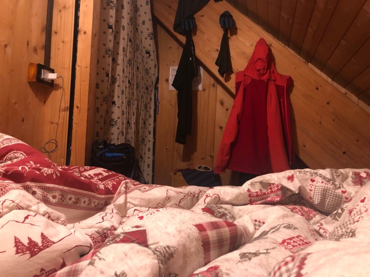 In der Capanna Fassa hat man bereits auf uns gewartet. Wir sind die letzten Wanderer auf der Übernachtungsliste. Eine sechsköpfige Gruppe hat aufgrund des schlechten Wetters abgesagt. Unsere kleine Schlafkoje – durch Vorhänge von den anderen Matratzenlagern getrennt – müssen wir deshalb mit niemand anderem teilen. Die kleine gemütliche Gaststube wird durch einen Holzofen geheizt. Wir hängen Jacken, Gamaschen und Rucksackbezüge zu den vielen anderen Kleidungsstücken, die über dem Ofen trocknen.