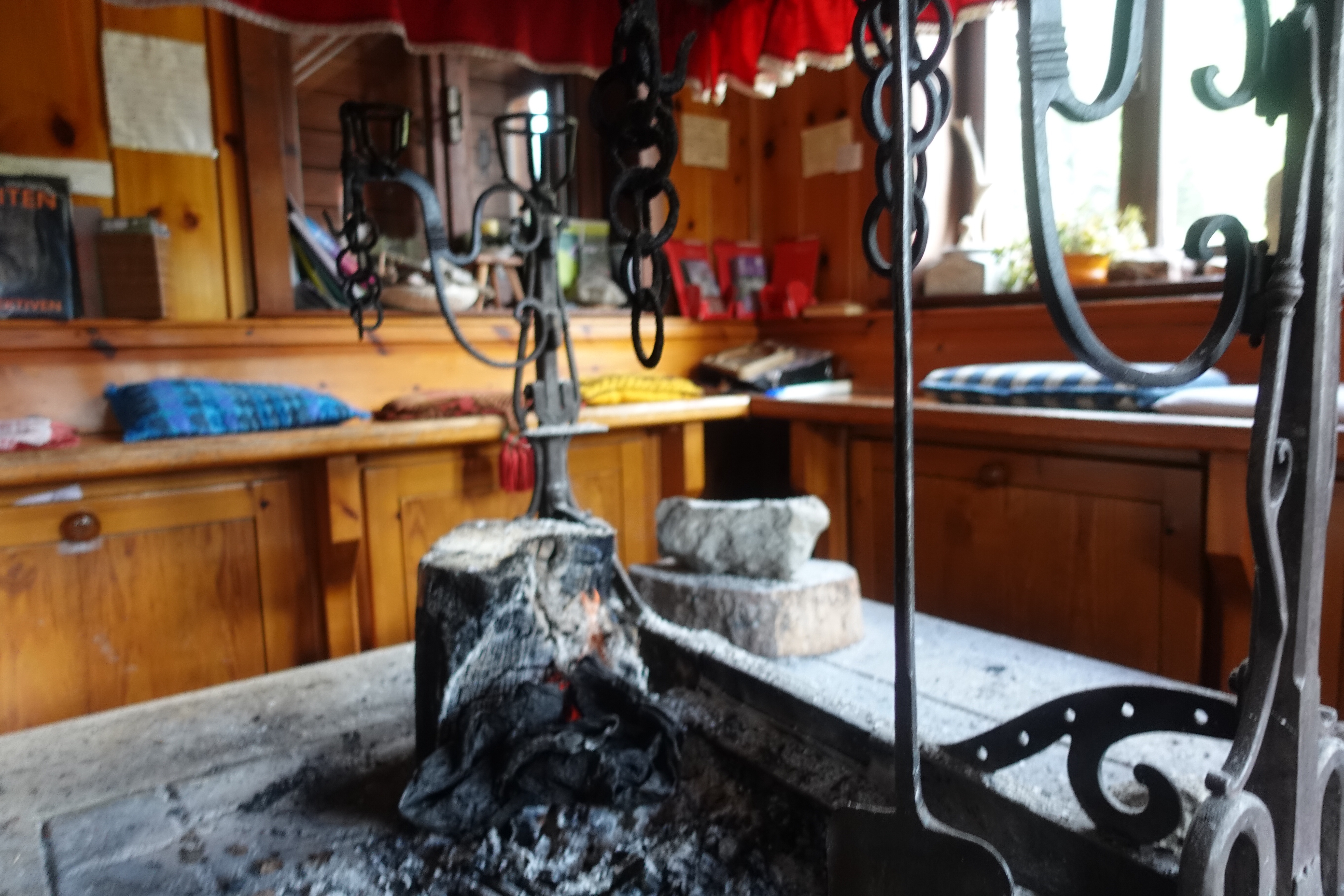 Am Nachmittag bleibt nun genug Zeit, um in der Gaststube zu entspannen. Ein riesiger offener Kamin bildet das Herzstück des Raumes. Schwere rote Raffbanderolen säumen den Abzug über der Feuerstelle. Rundherum sind halbhohe Sitzbänke mit bunten Kissen darauf angeordnet. Ein Stammquerschnitt glüht in der Mitte. Beniamino kommt gelaufen und bringt das Feuer noch einmal ordentlich in Gang. Er streicht über einen mächtigen Stein, der am Rande der gemauerten Feuerstelle liegt. „Das ist eine Skulptur von einem befreundeten Künstler,“ erklärt Beniamino. „Sie heißt Steinpilz.“ Ein Grinsen macht sich auf seinem Gesicht breit. Unschwer ist zu erkennen, warum der Stein diesen Namen trägt. Wie Pilze ragen glatt polierte Knubbel aus der Oberfläche hervor. Der Steinpilz ist eine der zahlreichen fossilen und steinernen Errungenschaften, die überall auf Fensterbänken und Tischen in der Hütte verteilt liegen. „Ich bin Geologe,“ meint Beniamino mit einem noch breiteren Grinsen und ich bin mir unsicher, ob er mich in diesem Moment verschaukelt.