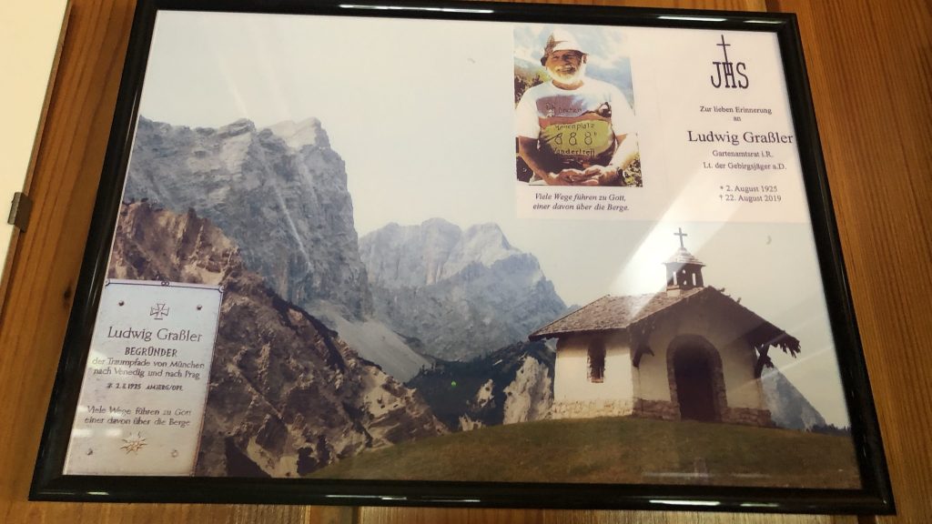 Als wir uns auf den Weg ins Bett machen, fällt mir schließlich ein großes Foto der Kapelle vom Halleranger ins Auge, das über der Tür zum Treppenhaus hängt. In der Ecke klemmt eine Trauerkarte mit dem Foto von Ludwig Graßler. Ich bin kein religiöser Mensch und dennoch kann ich sagen, dass sich der salbungsvolle Trauerspruch auf dieser Karte tief in mein Gedächtnis eingebrannt hat: „Viele Wege führen zu Gott, einer davon über die Berge.“