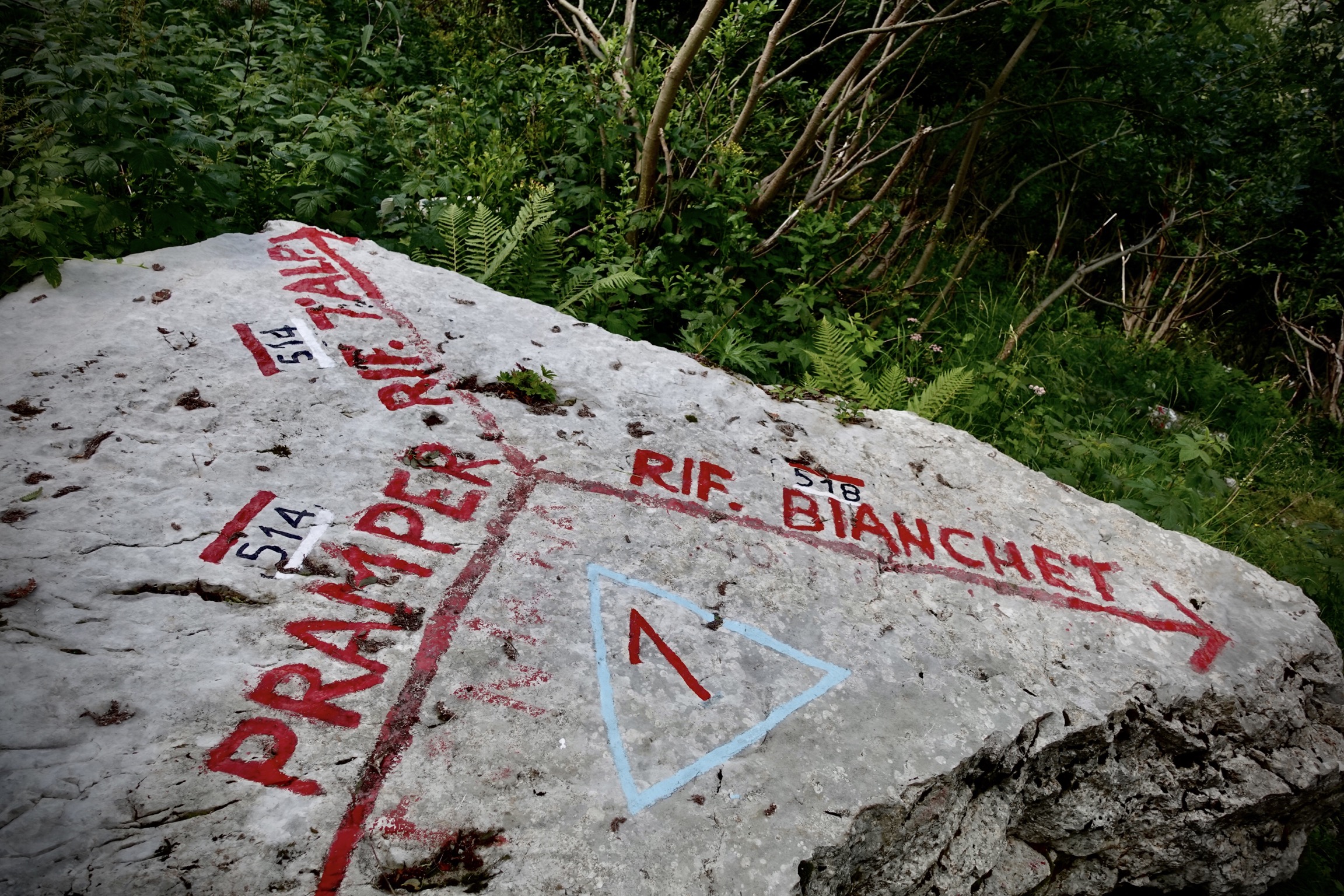 Der Abstieg ist dennoch steil. Dass wir etliche Höhenmeter hinter uns gelassen haben, spüren wir sehr konkret an den steigenden Temperaturen. Schließlich erreichen wir den Abzweig zwischen der Schiara und dem Rifugio Bianchet. Wir wählen den Weg nach unten Richtung Rifugio Bianchet. Durch dicht bewachsenen Wald kommen wir gegen 13.30 Uhr an der Hütte an. Es ist ruhig. Keine anderen Gäste in Sicht. Vor der Hütte erstreckt sich eine weite Wiese mit Liegestühlen. Wir bringen unsere Rucksäcke auf unser Doppelzimmer, essen eine vernünftige Portion Spaghetti al Ragù und lassen uns zufrieden in die Sonnenliegen fallen. Seit drei Wochen ist es das erste Mal, dass wir unsere Ankunft auf der Hüttenterrasse in der Sonne liegend zelebrieren können. Kurz hänge ich in Gedanken noch der Frage nach, was wir wohl verpassen, jetzt da wir die Übersteigung der Schiara auslassen. Währenddessen heftet mein Blick an dem Bergmassiv. Doch dann übermannt mich die Müdigkeit und binnen weniger Minuten schlafen wir beide ein.