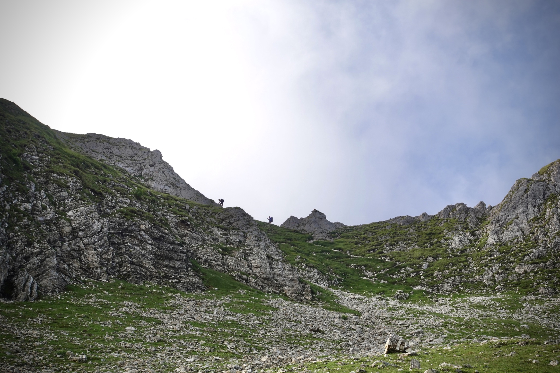 Der Hyperaktive rennt im Stechschritt den Berg hinab, während sein etwas älterer Begleiter sich zum Durchschnaufen hingesetzt hat. Als der Erste uns sieht, wedelt er aufgeregt winkend mit den Armen. Als wir sie wenig später einholen, fragt Sebastian, ob sie eine schwarze Regenjacke vermissen, weil im Zimmer eine hängen geblieben ist. „Oh ja, das ist wahrscheinlich meine. Hast du sie mitgebracht?“ fragt der Hyperaktive. Sebastian verneint. „Wir waren unsicher, ob ihr in diese Richtung weiterlaufen würdet.“ Der ältere von beiden beginnt laut zu lachen, während der Andere dem fortschreitenden Verlust seiner Ausrüstung mit ähnlichem Gleichmut begegnet, wie schon gestern Abend. „Ach naja, dann wird das wohl nix mehr mit kampieren.“ meint er nur stirnrunzelnd.