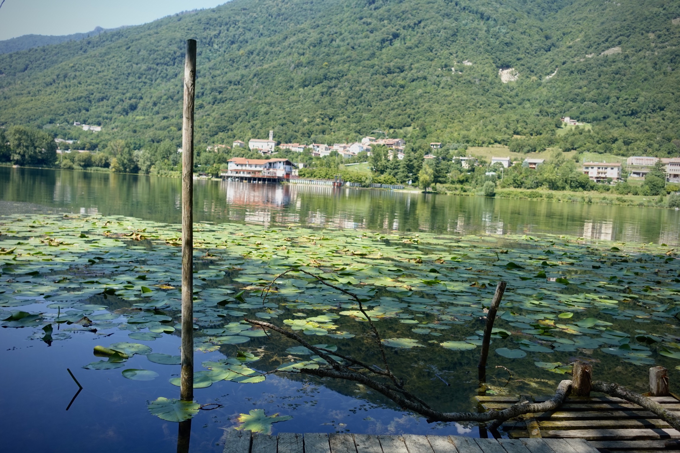 Nach einem kurzen Hatscher auf Asphalt, erreichen wir die Ufer des Lago di Santa Maria. Der Schatten und Schotteruntergrund tun gut. Auf der anderen Seite des Sees können wir die Menschen baden sehen. Ein wenig neidisch beobachte ich das Treiben. Eine Abkühlung würde ich mir jetzt auch wünschen, aber wir wollen nur voran- und vor allem ankommen. Lang dauert unser Uferspaziergang nicht, dann stehen wir wieder in der prallen Sonne und durchqueren das nächste kleine Dorf. Glücklicherweise gibt es auch dort eine Wasserquelle. Wir halten unsere Halstücher darunter und legen sie uns kalt und nass in den Nacken. Riesige Oleandersträucher wachsen hier in den Vorgärten. Nach einer weiteren halben Stunde sind wir bereits in Tarzo. Die Siesta ist noch immer nicht vorüber. Aber wenigstens hat eine Gelateria geöffnet. Mit einem Eis setzen wir uns auf die Terrasse und atmen kurz durch. Gleich nebenan ist eine Apotheke. Das Reklamekreuz zeigt abwechselnd Temperatur und Uhrzeit an. 35°C – wir zerlaufen, wie das Eis in unseren Händen.