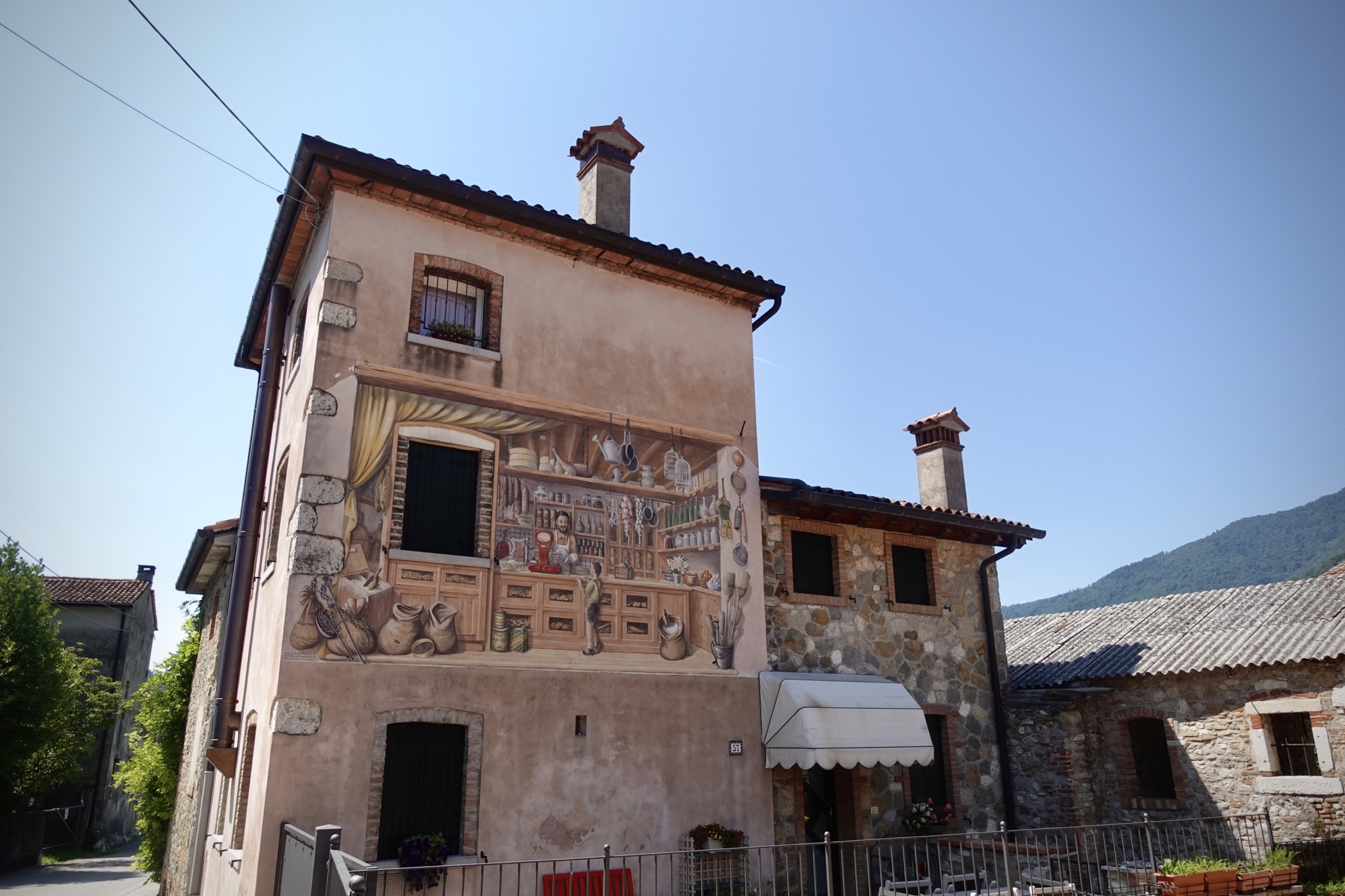 Gegen halb zwölf erreichen wir Revine, ein kleines verschlafenes Dorf. Im Zentrum gibt es einen Metzger und eine Bäckerei. Eine Taverne an der Straßenecke hat schon Siesta. Also holen wir uns ein paar Brötchen und setzen uns in den Schatten der Bäume auf dem Marktplatz. Dazu gibt es Pfirsiche, die wir in Belluno gekauft hatten. Die Stimmung ist etwas gedrückt. Die Wärme schlägt auf’s Gemüt und wir hatten uns auf eine ordentliche Mahlzeit gefreut. Doch das spärliche Mittagessen muss reichen und so machen wir uns gegen 13.00 Uhr weiter auf den Weg nach Arfanta. Vorher kommen wir aber noch an einer Trinkwasserquelle vorbei, füllen unsere Wasserflaschen auf und wechseln die Schuhe. Ab jetzt baumeln die Wanderstiefel am Rucksack und ein angenehm leichtes Gefühl breitet sich an den Füßen aus.