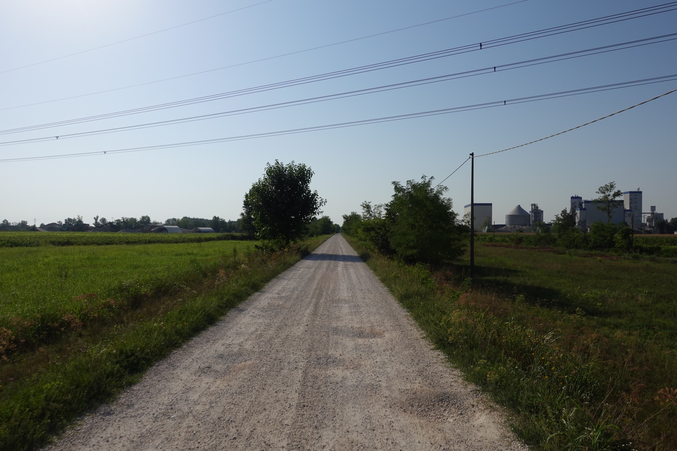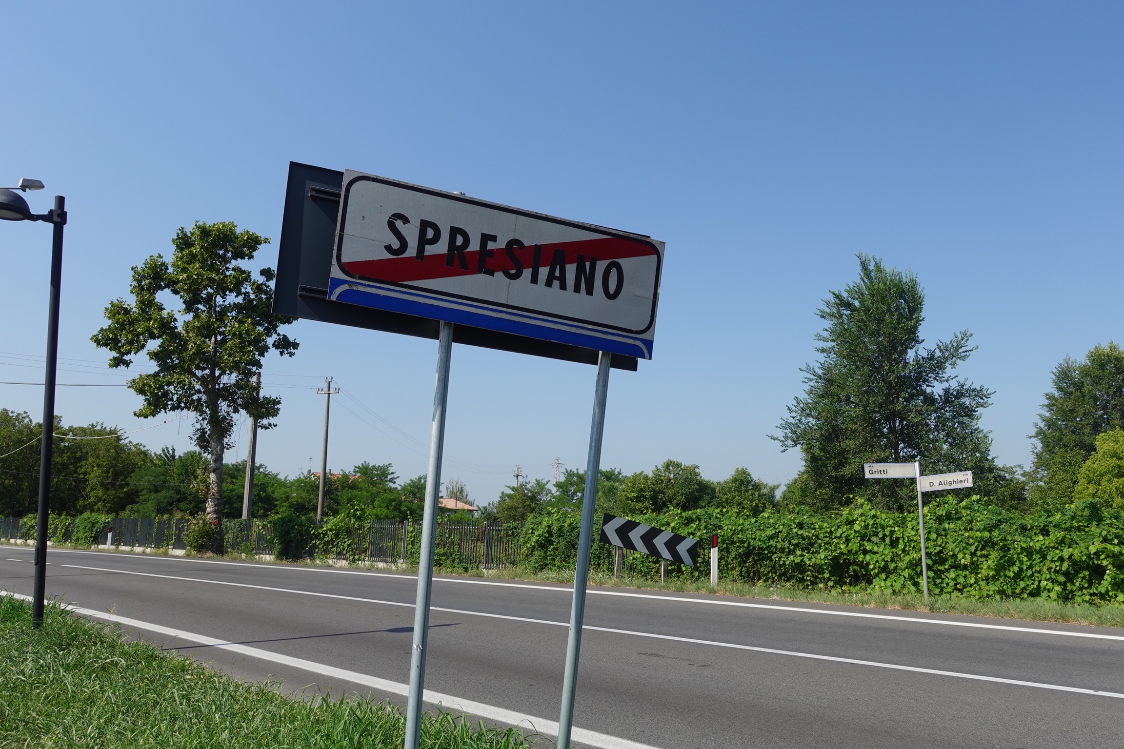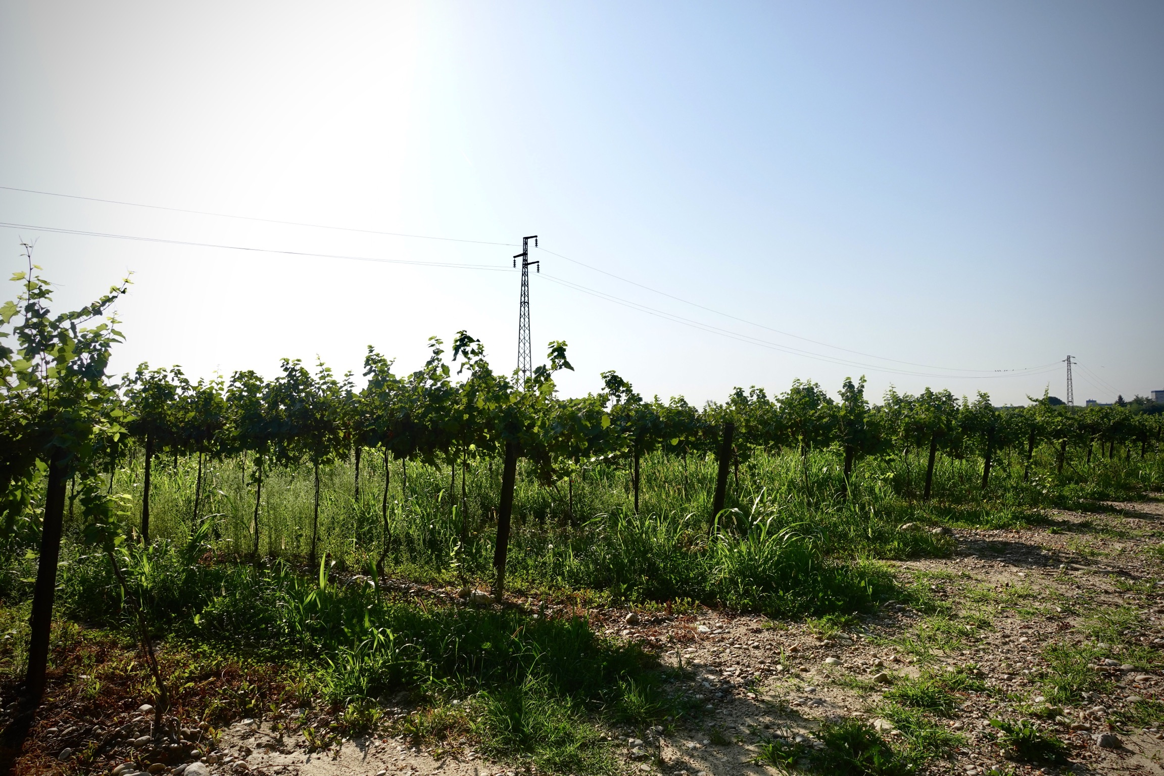 Wir müssen einen eigentümlichen Eindruck auf sie machen. Mit unseren großen Rucksäcken, den Wanderstöcken und Bergstiefeln fallen wir mit jedem Meter, den wir zwischen uns und die Alpen bringen, mehr aus dem Rahmen. Eine Weile bewegen wir uns noch parallel zum Fluss Piave bis sich unser Weg in der Nähe von Spresiano endgültig von der klassischen Route trennt. An einem Kieswerk vorbei laufen wir ins Zentrum von Spresiano, um in einem Supermarkt Wasser und kleine Naschereien zu besorgen.
