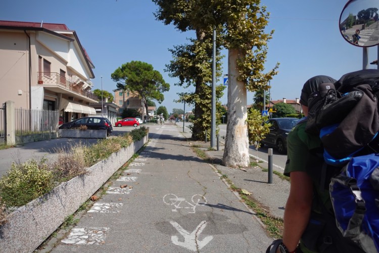 Nach der Mittagspause sind es nur noch wenige Kilometer bis zum Canale Piavesella. Dort kommt endlich ein Stück Genusswandern zurück, denn entlang des Kanals führt ein Radweg (!) im Schatten von Bäumen (!!!). Wir entrinnen also dem Autoverkehr und freuen uns über einen Routenabschnitt mit regelmäßigen Rastplätzen, Mülleimern und Schatten. So niedrig sind mittlerweile unsere Ansprüche. Blau plätschert der Kanal neben uns. Radfahrer gibt es kaum. Da wir die klassische Venedigroute verlassen haben, fallen wir augenscheinlich noch stärker auf als zuvor. In Carità hupt uns ein junger Italiener aus seinem Fiat Punto heraus an, fährt im Schritttempo neben uns her und lässt das Fenster nach unten. Er fragt, ob wir den Camino laufen. „No, stiamo facendo un’escursione da Monaco a Venezia“, antworte ich mit meinem auswendig gelernten Satz. Das ringt ihm einigen Respekt ab und er bietet uns Trinkwasser an. Da unsere Flaschen aber noch voll sind, bedanken wir uns und laufen weiter.