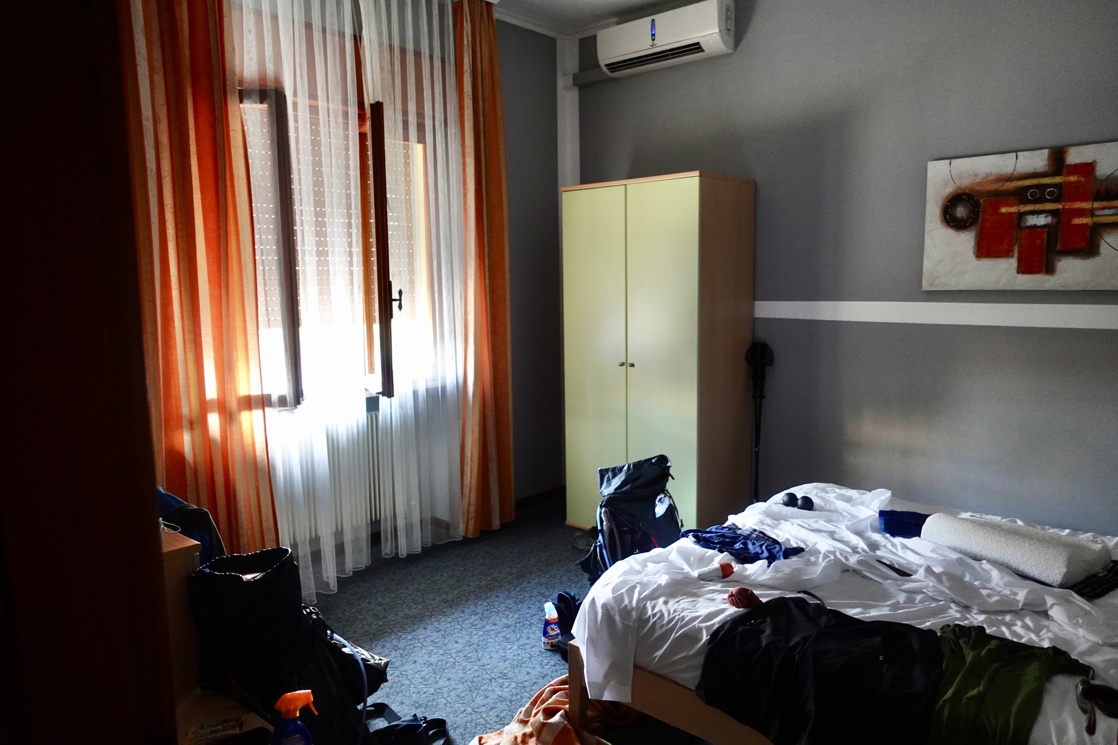 Wenig später durchfährt mich in der Dusche ein stechender Schmerz, als die ersten Wassertropfen meine Waden benetzen. Einfach wegatmen, denke ich und hole wiederholt tief Luft. Den Rest des Nachmittags verbringe ich wie gerädert auf der Couch und nicke gelegentlich weg. Nachdem unser Gastgeber das Frühstück, bestehend aus einem Keks und einem Joghurt, gebracht hat, tigert Sebastian noch einmal zum nächstgelegenen Supermarkt, damit wir morgen nicht nahezu leerem Magen starten müssen.
