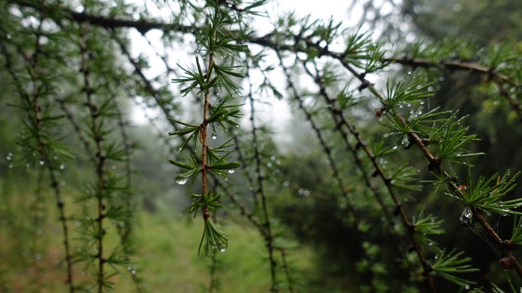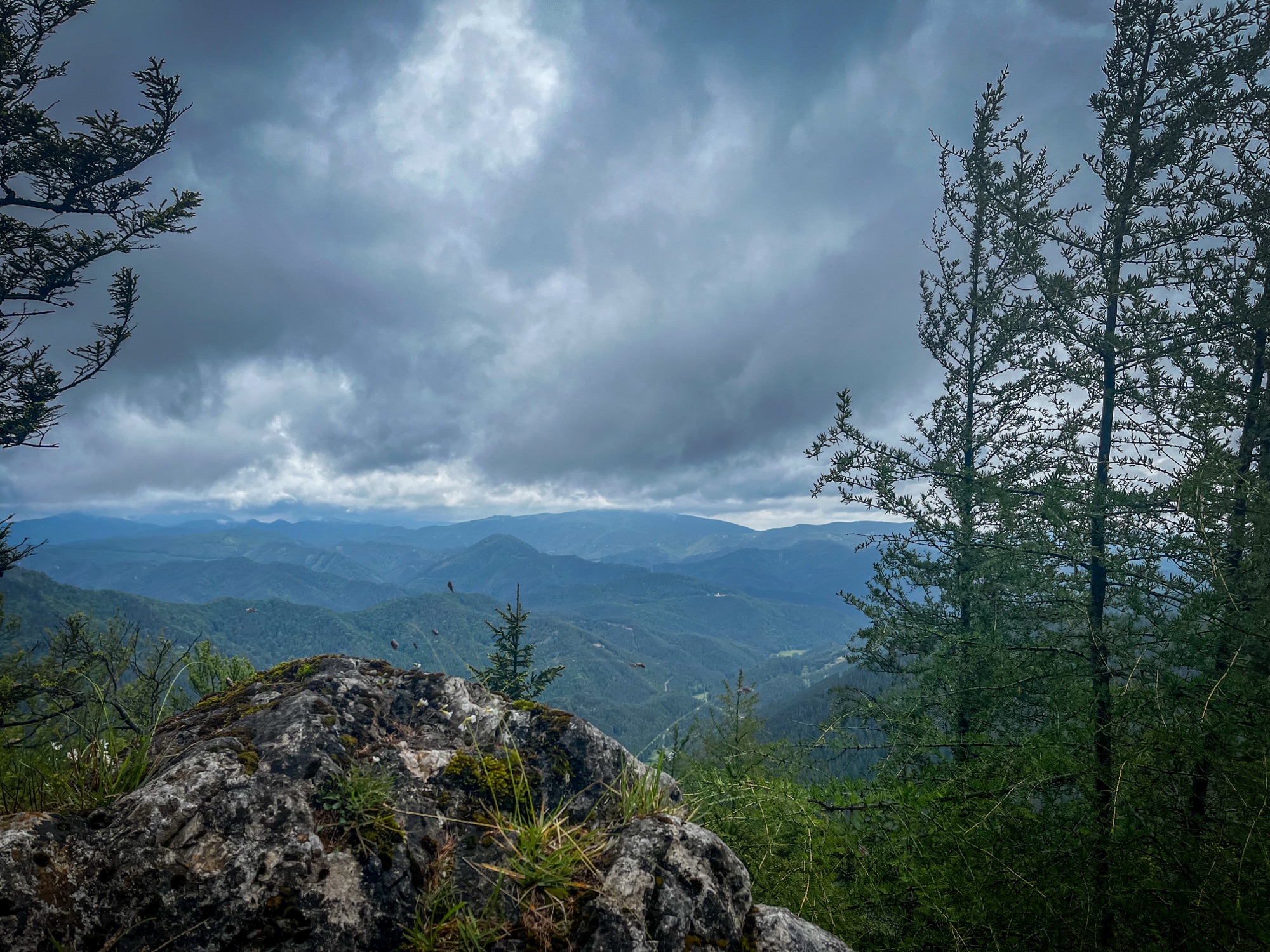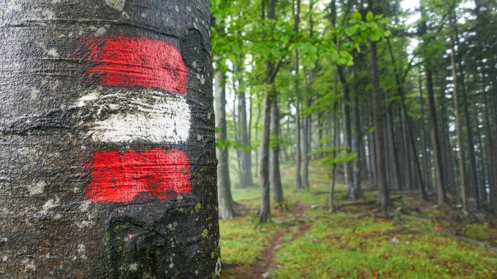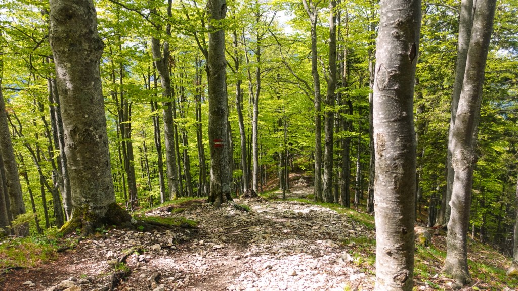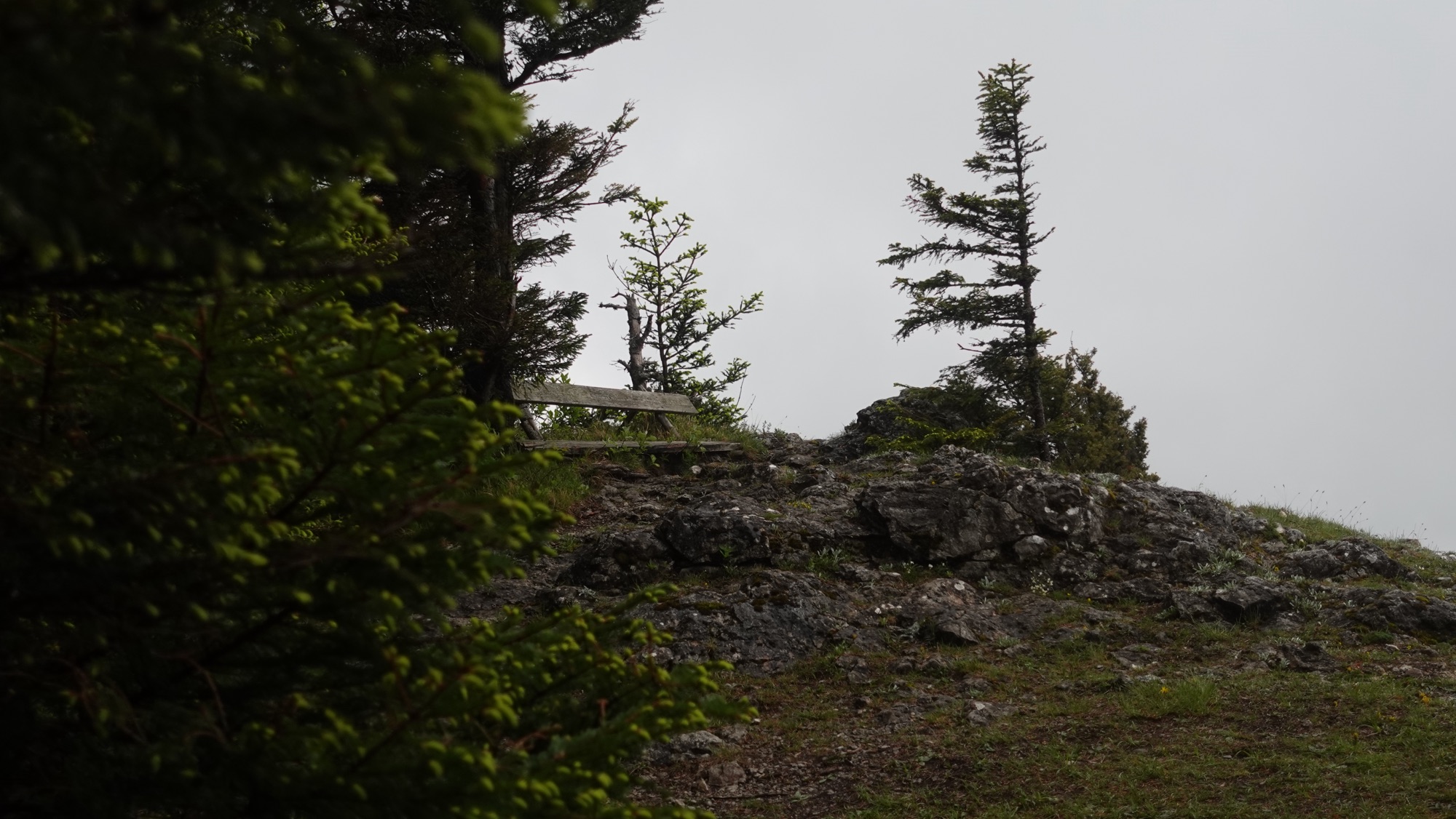 Während des steilen Aufstiegs durch den Wald beginnt es immer wieder zu regnen. Am Kamm angekommen pfeift schließlich der Wind und drückt von Norden gegen die Felsen. Zum Glück verläuft der Weg entlang des Kamms immer geschützt im Wald.
