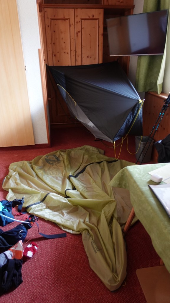 Gegen Nachmittag reist der Himmel auf. Auf der Mamauwiese kommt schließlich die Sonne richtig hinter den Wolken hervor und begleitet mich bis ins Tal nach Losenheim. Hier habe ich mich ins Hotel Forellenhof eingebucht. Nicht ganz günstig, aber Sauna und Frühstück sind im Preis inbegriffen. Nachdem ich mein Zelt zum Trocken noch einmal verkehrtherum im Zimmer aufgebaut habe, mache ich von dem unverhofften Luxus Gebrauch und gönne mir zwei Saunagänge. Die Wärme entspannt meine strapazierten Muskeln in Beinen und Rücken.
