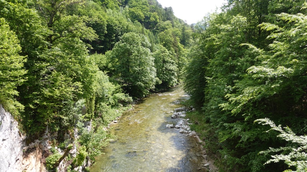 Im Höllental angekommen mache ich ein paar Bilder von der Schwarza und schon hat mich der schmale junge Kerl wieder eingeholt. „Wo gehst du hin?“ frage ich. „I don‘t understand. Only French or English,“ gibt er zurück. Wir kommen kurz ins Gespräch. Es stellt sich heraus, das Etienne, wie er heißt, aus Frankreich kommt und ein ganz ähnliches Projekt hat wie ich. Er will ebenfalls ans französische Mittelmeer laufen. Anders als ich ist er aber erst gestern und von Puchberg am Schneeberg gestartet und will vor allem im Zelt übernachten. Auf die Rax geht er deshalb heute nicht. Zu windig.