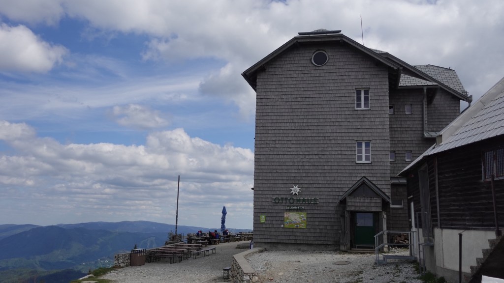 Erleichterung macht sich breit, als ich endlich flache Wiesen erreiche und das Schild „Ottohaus“ erspähe. Nach einer weiteren halben Stunde erreiche ich die Hütte und gönne mir auf der Terrasse ein Radler. Links von mir habe ich einen gigantischen Blick auf den Schneeberg, vor mir liegen Edlach und Reichenau an der Rax. Als ich ausgetrunken habe, beziehe ich mein Zimmer. Doch der Winter steht quasi noch in dem altehrwürdigen Haus. Hier drinnen ist es kälter als draußen. Ich reiße das Fenster meines Zimmers auf und weiß schon jetzt: Haare waschen fällt aus und hierher werde ich nur zum Schlafen kommen. Erstaunlicherweise ist die warme Dusche in der Hütte kostenfrei.