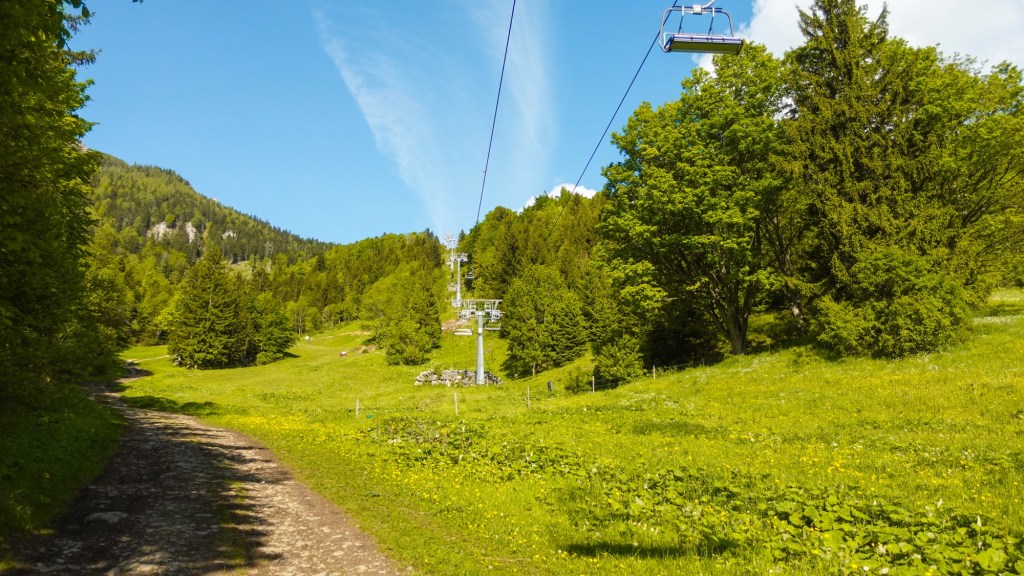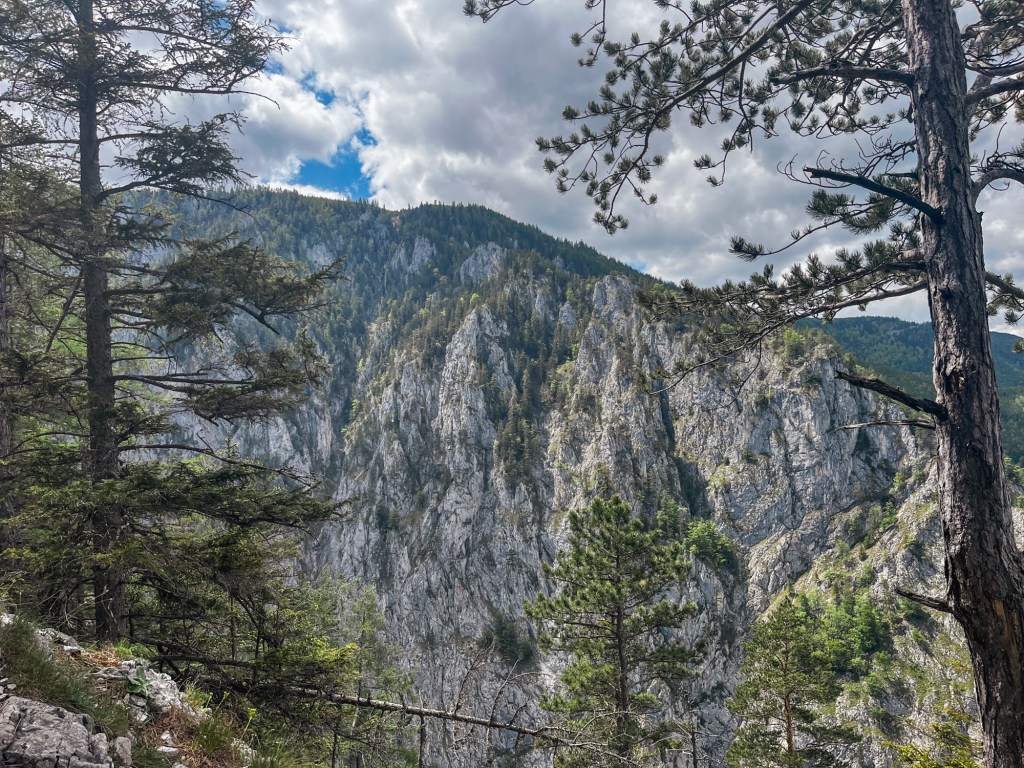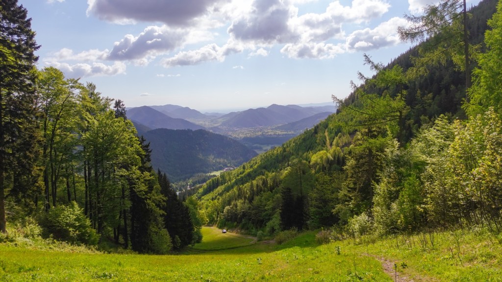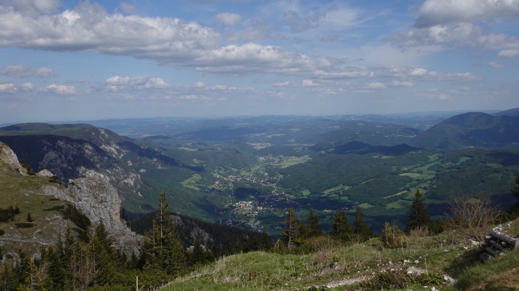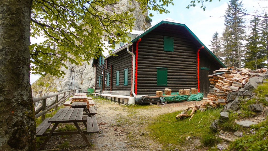 Nach einem guten Frühstück breche ich endlich auf Richtung Rax. Den Schneeberg werde ich links liegen lassen. Zu lang wäre die Etappe, nachdem ich ja unfreiwillig heute Zusatzhöhenmeter schrubben muss. Bis zur Edelweisshütte stapfe ich die Skipiste nach oben. Nach einer Dreiviertelstunde bin ich am eigentlichen Ausgangspunkt angekommen. Nördlich umrunde ich den Gebirgsstock des Schneebergs und steige durch Mischwald ab ins Tal. Bei der Kienthalerhütte biegt ein drahtiger, junger Mann mit großem Rucksack vor mir auf den Weg und läuft flink bergab. Er ist offensichtlich auch länger unterwegs, denn außen an seinem Rucksack hat er das Zelt befestigt. Als der Wanderweg wieder zu Forstweg wird, hole ich ihn bei einer Trinkpause ein und düse vorbei.