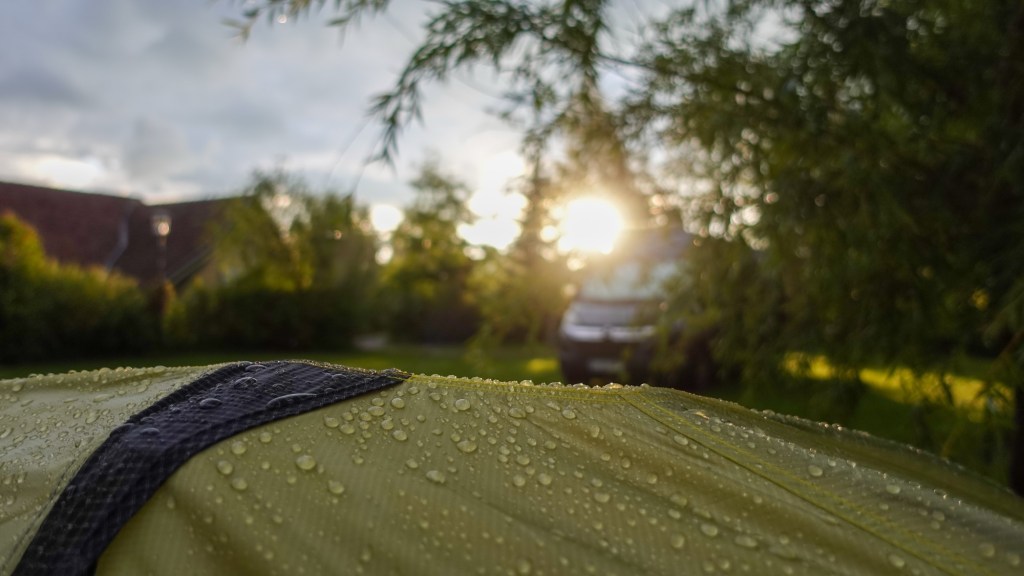 5.00 Uhr klingelt mein Wecker. Bis 6.00 Uhr soll es eine Regenpause geben und die möchte ich nutzen, um mein Zelt abzubauen. Der Schlafsack ist klamm. Im Sanitärgebäude hänge ich ihn zum Auslüften auf. Rasch lasse ich die Luft aus meiner Isomatte und packe meinen Rucksack zusammen. Die Außenzeltplane hänge ich, so lang es geht, noch über den Stromkasten zum Trocknen. Dann lasse ich mich auf der Bank vor dem Sanitärgebäude nieder und koche mein Frühstück.