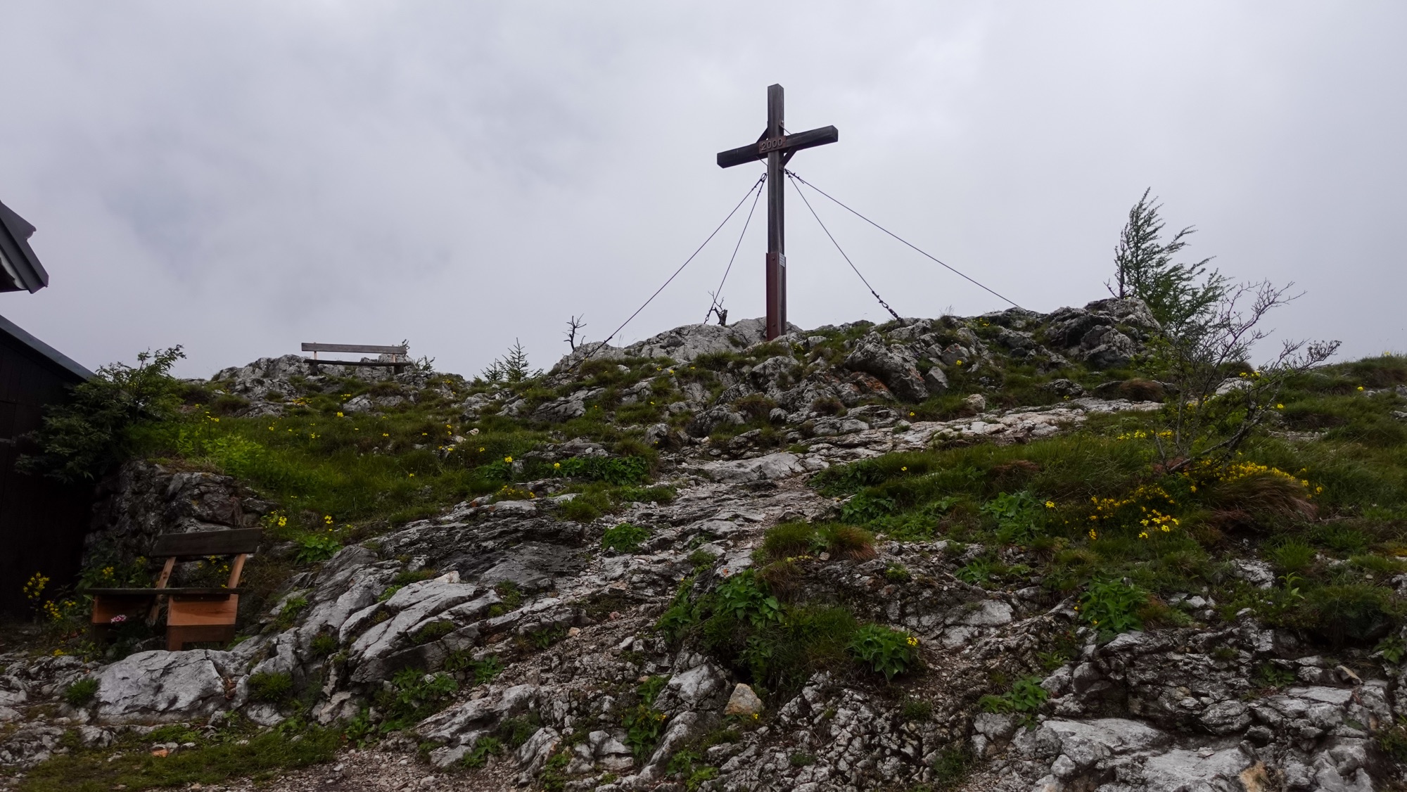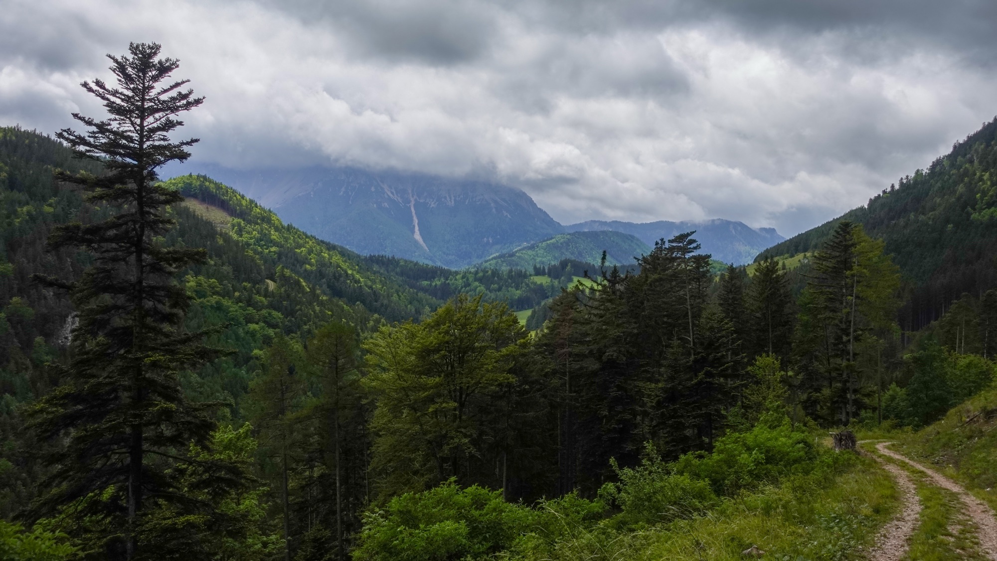 Gegen 13.00 Uhr habe ich das Tal erreicht und gönne mir unter einer großen Kastanie eine Mittagspause mit geschmierter Semmel. Gleich daneben liegt die Talstation der Materialseilbahn, die das Habsburghaus versorgt. Allzu bald soll es eigentlich nicht regnen. Trotzdem mache ich mich rasch wieder auf die Socken. Schließlich muss ich all die Höhenmeter auf der anderen Seite wieder nach oben über den Nasskamm.