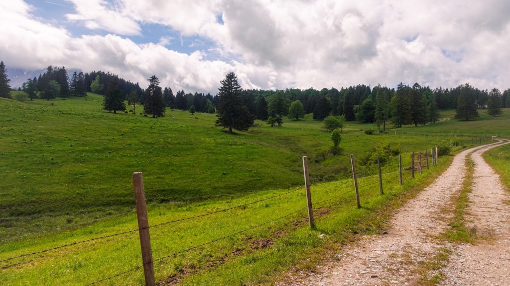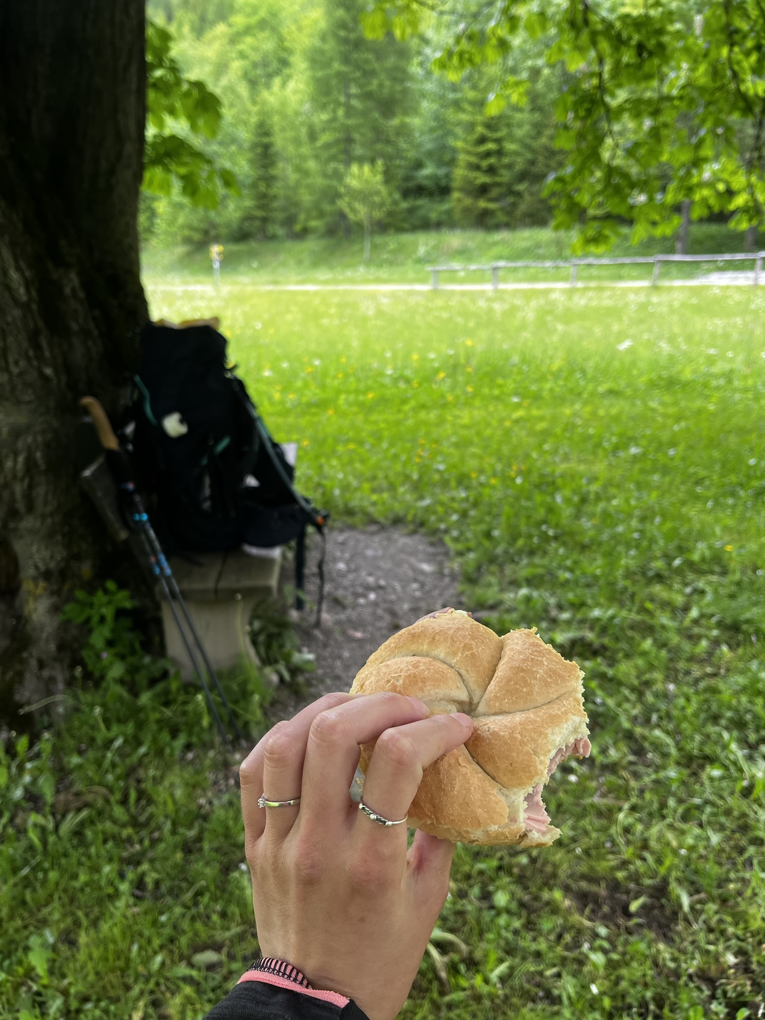 Währenddessen beginnt es wieder zu regnen. Ich hechte Richtung Zeltplane, verstaue sie außen am Rucksack. Sie muss unterwegs trocknen. Im Sanitärgebäude packe ich alle anderen Sachen zusammen, als ein anderer Camper mich anspricht und verwundert feststellt, dass ich noch da bin. Kurz kommen wir ins Gespräch über meine geplante Alpendurchquerung. Er macht große Augen. „Wir kommen aus Lübeck und wollten uns das jetzt auch mal anschauen. Bisher waren wir noch nie in den Alpen.“ Jetzt mache ich, die seit ihrer Kindheit unzählige Male in den Alpen gewesen ist, große Augen. Als ich 8.00 Uhr aufbreche, kommt die Sonne heraus. Trotzdem regnet es weiter. Über Waidmannsfeld laufe ich in Richtung Dürre Wand.