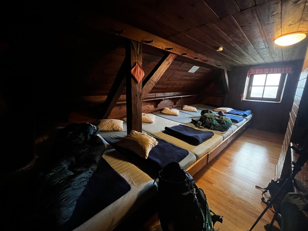 Das Zimmer ist sehr gemütlich und modern eingerichtet. Ich hänge meine nasse Kleidung zum Trocknen auf und stelle fest, dass mein Rucksack tatsächlich ein paar Schwachstellen bei Regen hat. Künftig werde ich auch um den Schlafsack eine Plastiktüte ziehen.