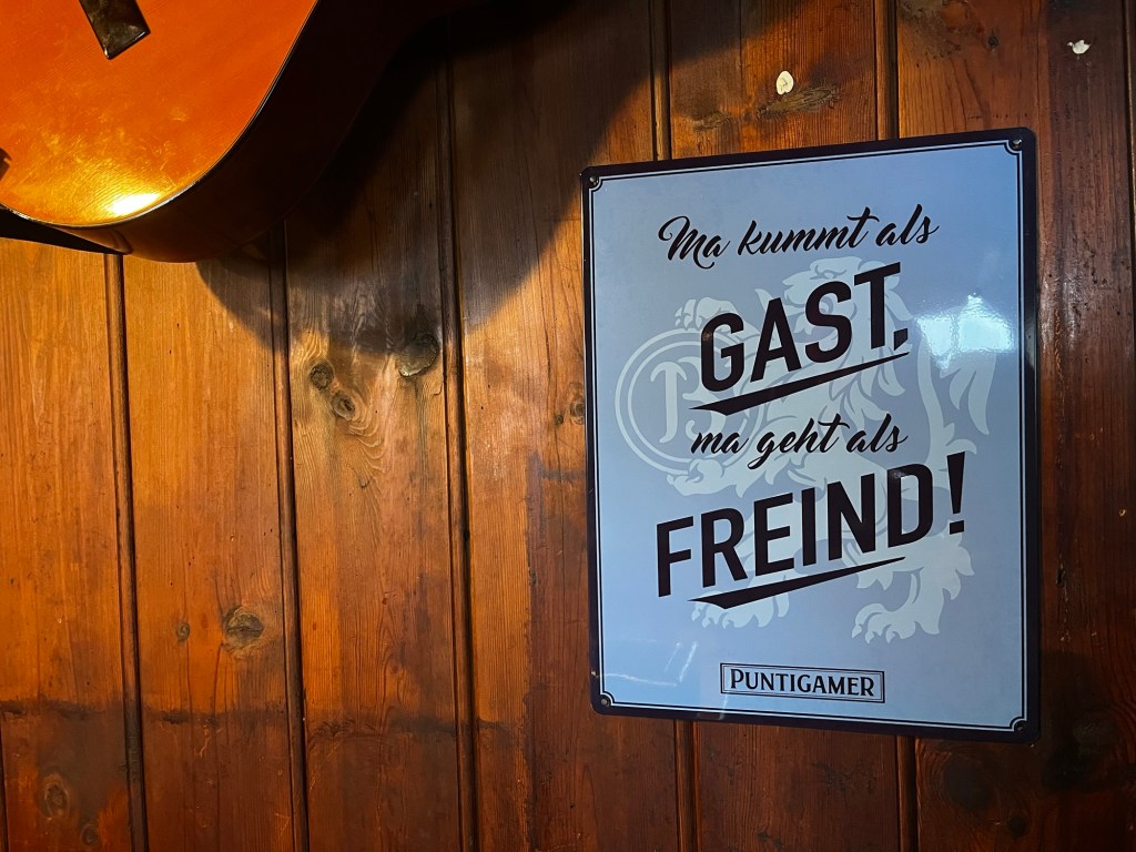 Anschließend lasse ich mich im Gastraum nieder. Der ist mollig eingeheizt. Im Ofen knistert das Feuer. In der riesigen Hütte sind wir heute Abend nur zu dritt. Außer mir ist noch ein schwedisches Pärchen im mittleren Alter zu Gast. Ich frage, ob ich mich zu ihnen setzen darf und wir kommen ins Gespräch. Sie ist Sozialarbeiterin und auf Austausch in Österreich. Er hingegen ist vor allem hier, um seine Frau zu besuchen und den Urlaub zu verbringen.