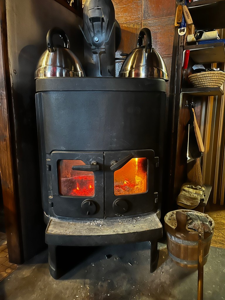Als die wesentlichen Eckpunkt des Woher, Wohin und Was ausgetauscht sind, setzt sie sich gemütlich auf die Eckbank und vertieft sich in ihr Buch. Dieses Bild und das Knistern des Feuers entschleunigt die Raserei in meinem Kopf, die ich bisher noch immer nicht ganz ablegen konnte. Ruhe durchströmt mich und ich schaue eine Weile einfach nur in die warme Ofenglut.