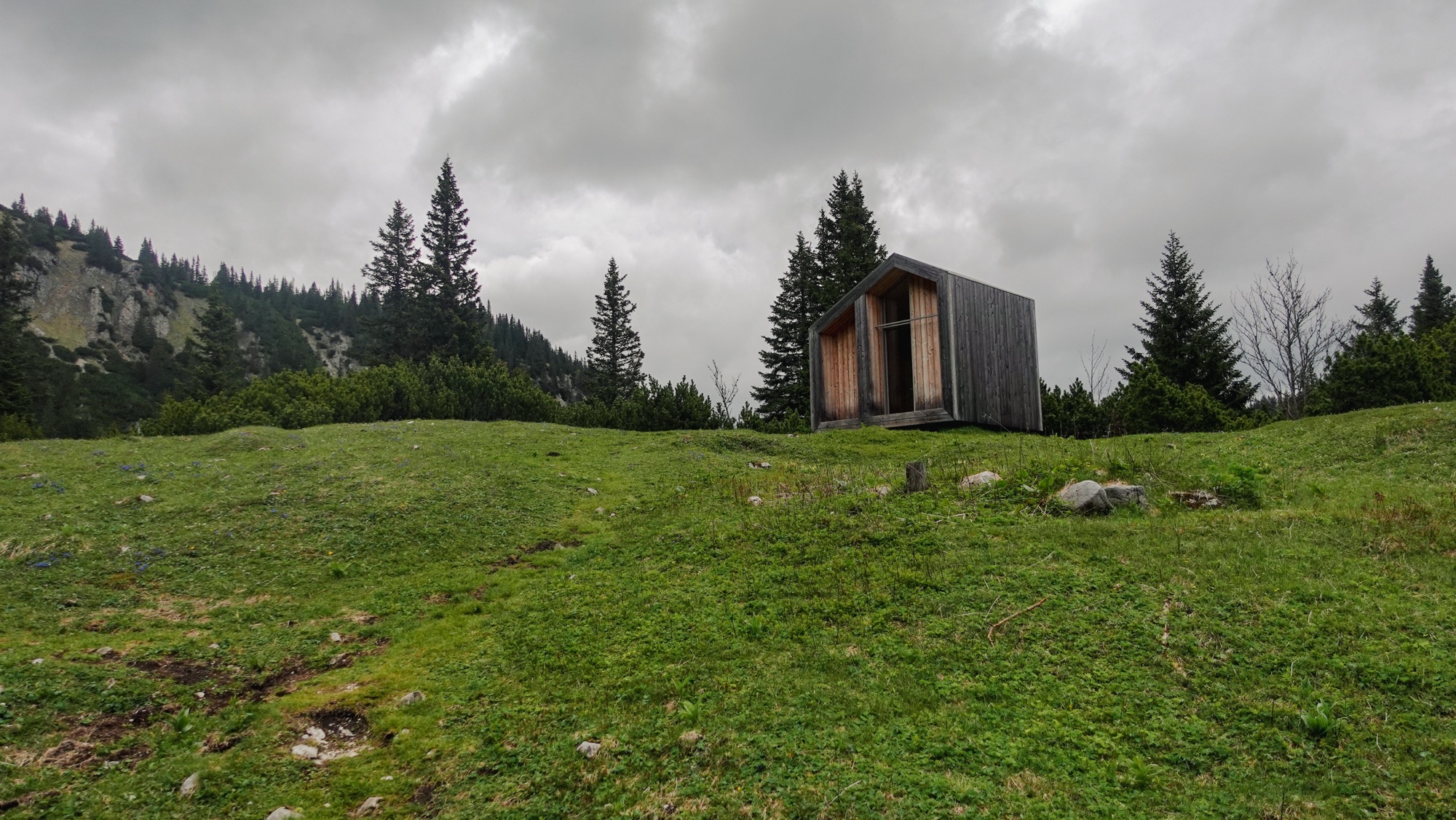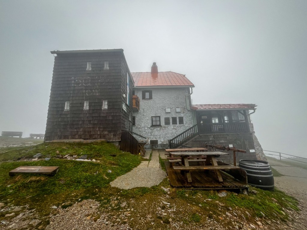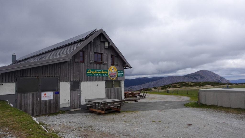 Als ich die Lurgbauerhütte erreiche, stürmt es plötzlich. Ich muss ordentlich gegenhalten, um voranzukommen. Ich quere das Plateau und als das Schneealpenhaus schon in Sicht ist, beginnt es zu nieseln. Binnen weniger Minuten wird ein ordentlicher Schauer daraus und ich betrete die Hütte mit tropfender Regenkleidung. Drinnen ist es mollig warm. Ein Feuer knistert im Ofen. Zwei junge Frauen, etwa in meinem Alter, sitzen in einer Ecke und unterhalten sich angeregt. Auch ein Pärchen im gleichen Alter sitzt an einem anderen Tisch.