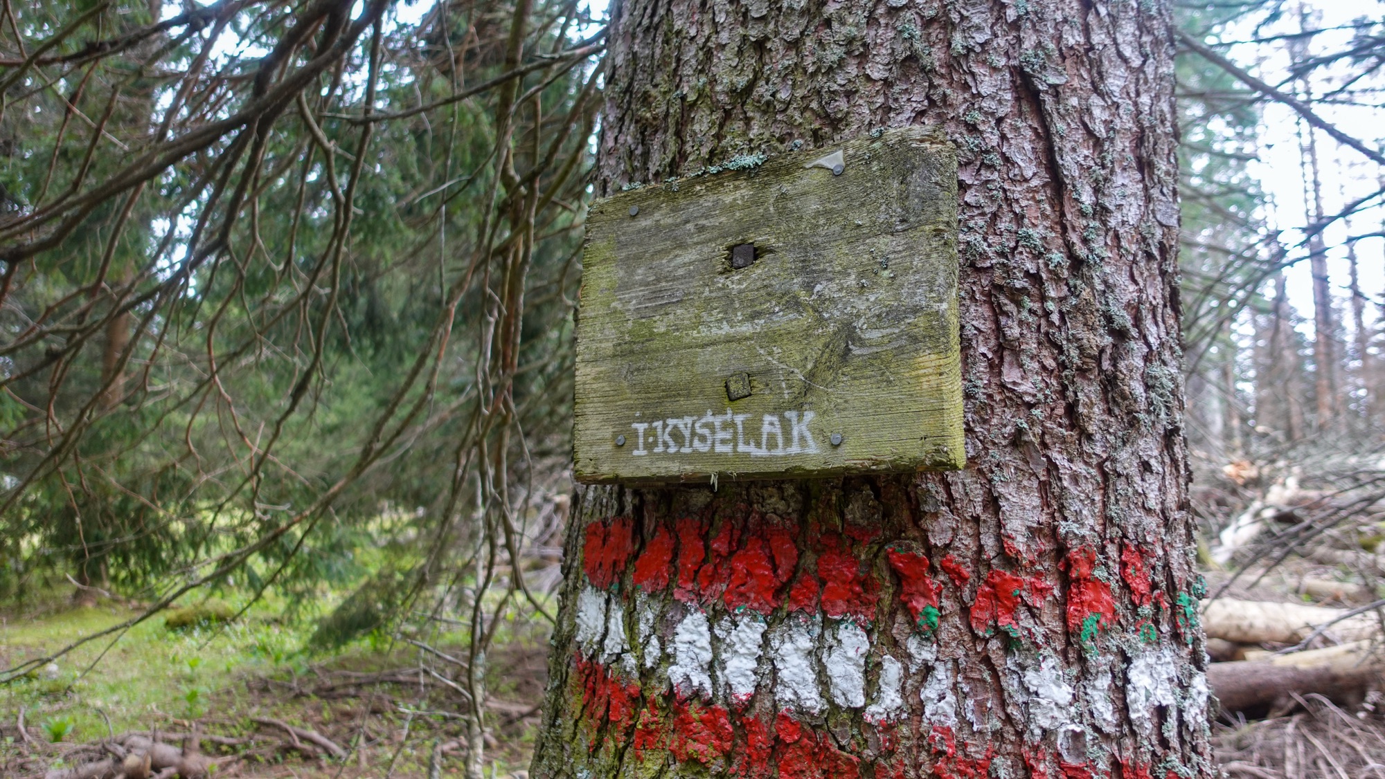 Gegen 11.00 Uhr bin ich am Habsburghaus und steige über den Kaisersteig hinab wieder zurück in waldiges Gebiet. An einer Fichte erspähe ich ein Schild mit weißer Schrift „J. Kyselak“. Sofort werde ich an Hans Thurners Buch erinnert. Auch er und seine Partnerin hatten diese Kritzeleien gesehen. Die Geschichte dahinter: Im Sommer 1825 wanderte Josef Kyselak mehrere Monate durch Österreich. Überall, wo er entlang kam, aber vor allem an besonders schönen Punkten, hinterließ er seinen Namen. Kaiser, Franz der I., rief ihn daraufhin zu sich und befahl ihm, die Kritzeleien zu unterlassen. Kyselak willigte ein. Der Legende nach soll aber auch die Tischkante des Kaisers die Inschrift „Kyselak“ getragen haben, als dieser den Raum wieder verlassen hatte. Auch wenn die Kritzelei hier deutlich jünger ist, erinnert sie an einen Weitwanderer der ersten Stunde.