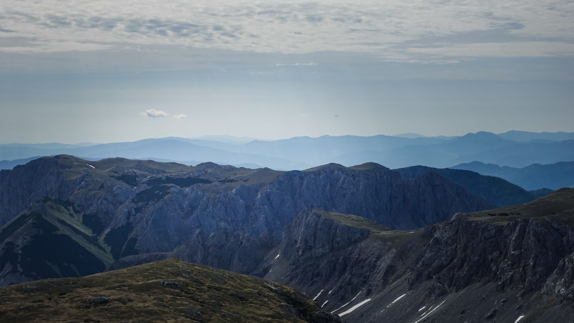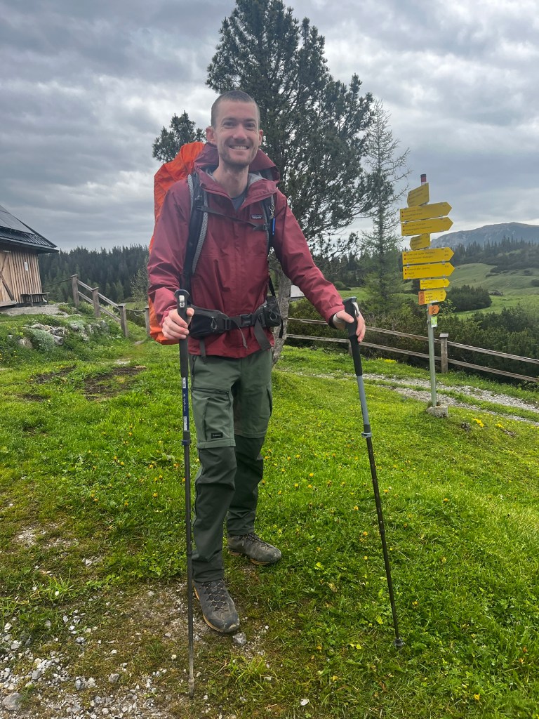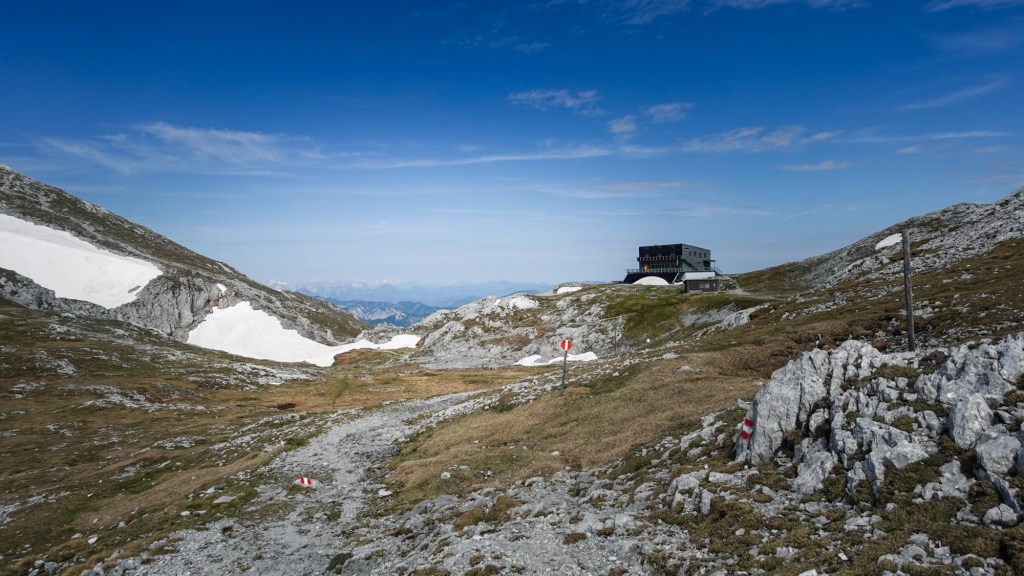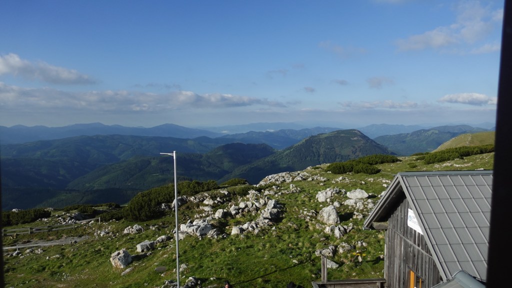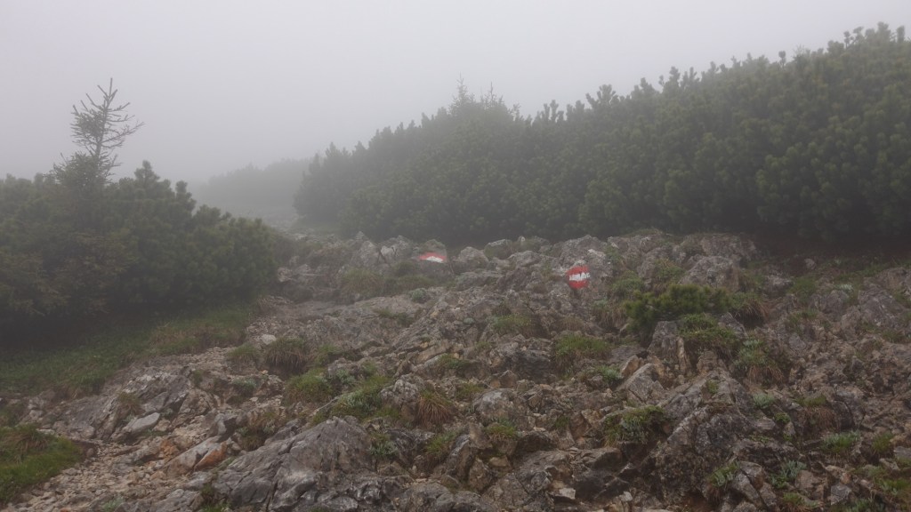 In der Hütte treffe ich ein bekanntes Gesicht wieder. Étienne, der Franzose, der vor ein paar Tagen in Puchberg am Schneeberg losgelaufen ist, hat die letzte Nacht hier in der Hütte verbracht und ist gerade am bezahlen. Wir tauschen uns über unsere letzten Tage aus und dann verschwindet er in der Wolkensuppe vor der Hütte.