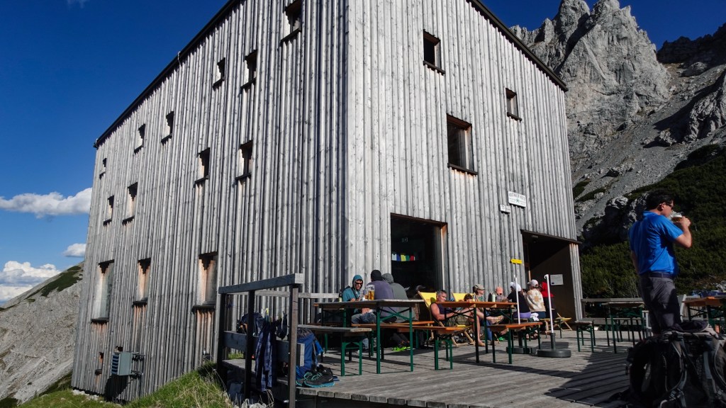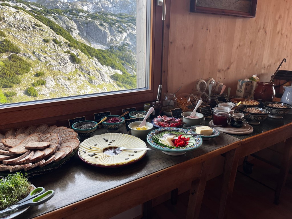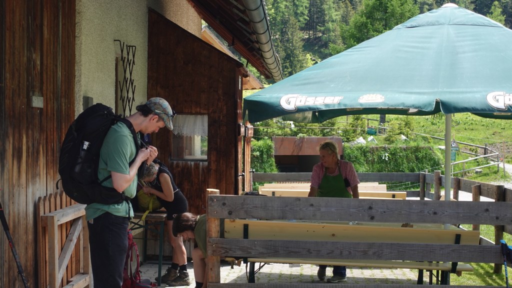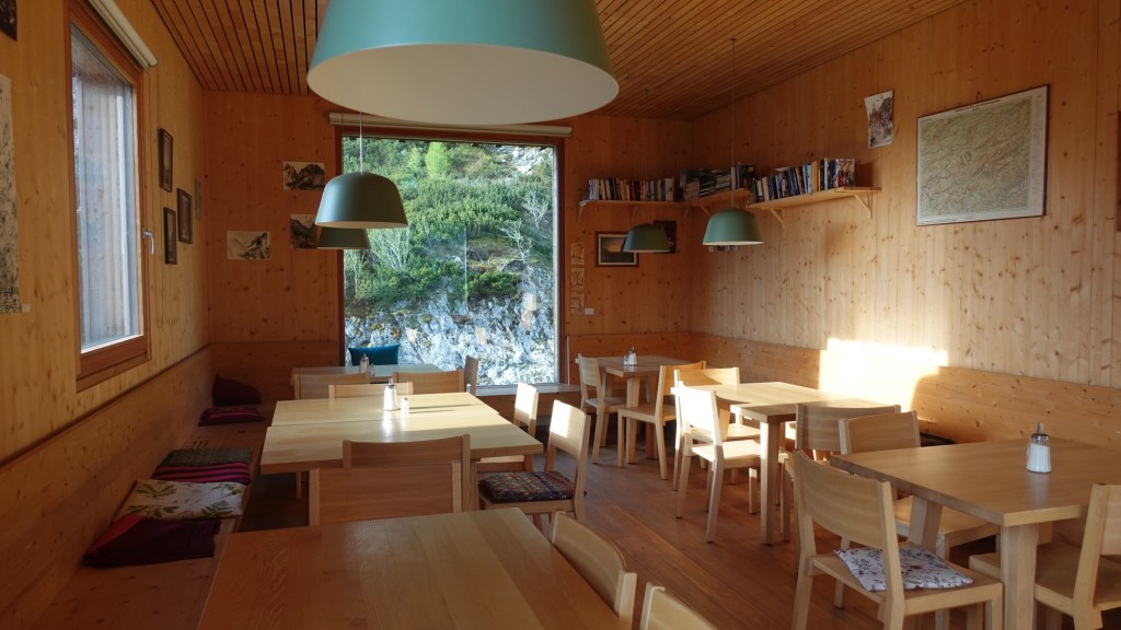 Vorerst sitze ich mit einem Pärchen im mittleren Alter an einem Tisch und wir unterhalten uns über das Wandern und meine Tour. Wenig später kommt aber eine ganze Gruppe junge Männer zur Tür herein. Zwei weitere Wanderer nehmen am Tisch neben mir Platz. Als sich das Paar an meinem Tisch wieder in Richtung Tal verabschiedet und mir eine gute Reise wünscht, verbreiten sich meine Wanderpläne wie ein Lauffeuer an den anderen beiden Tischen und sorgen dafür, dass ich „im Gespräch“ bleibe.