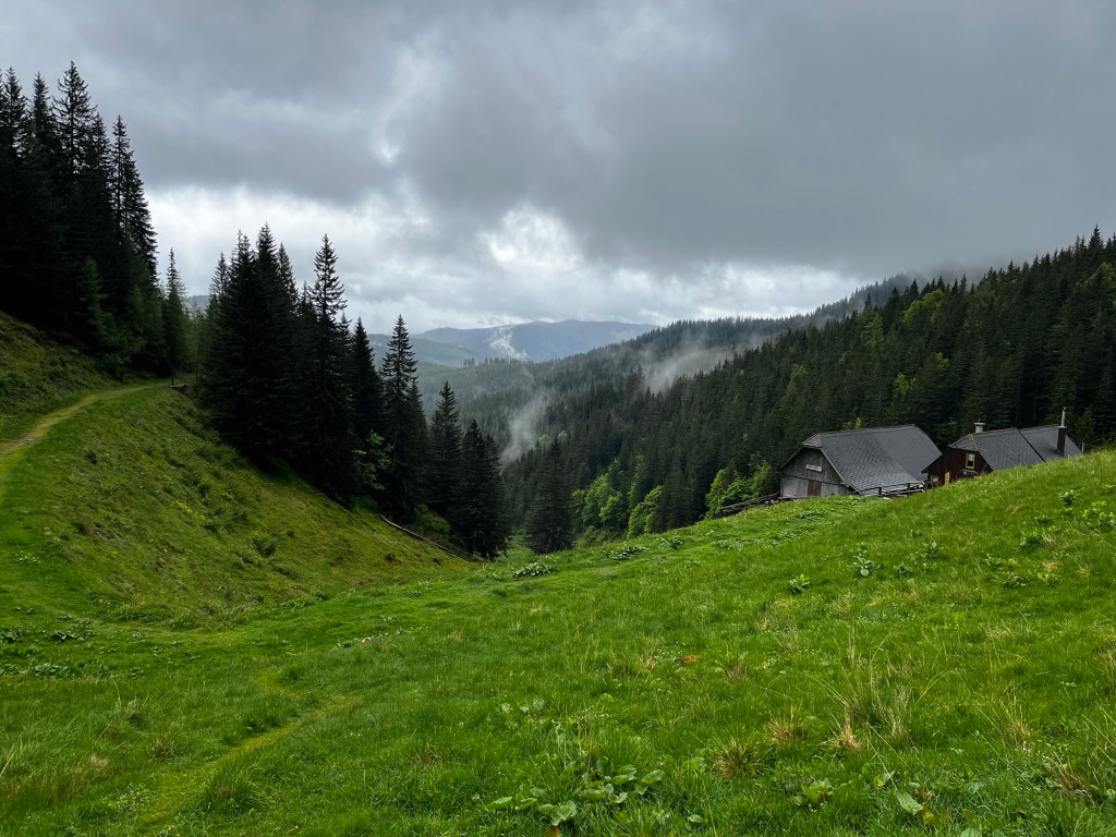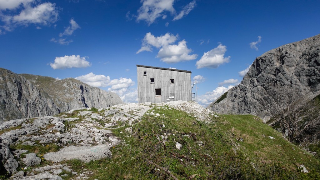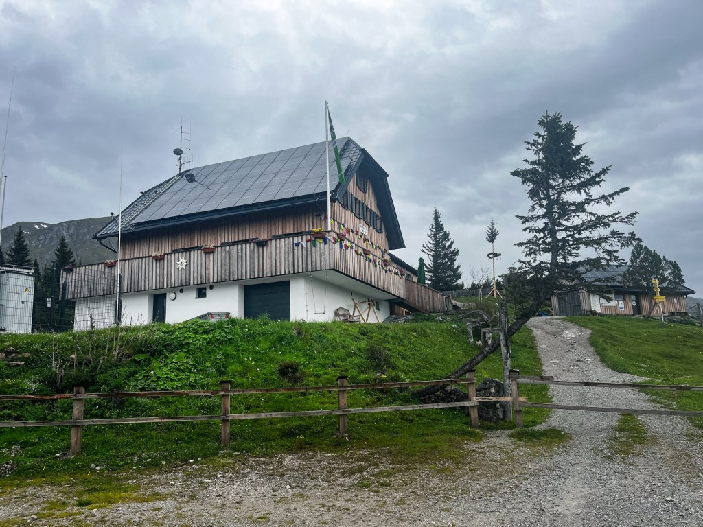Der Großteil der Gruppe entschließt sich trotzdem, den Anstieg über die Berge in Angriff zu nehmen. Nur Max, Moritz und Walter wollen über den Talboden aufsteigen. Weil die Drei noch ihr Auto umparken wollen, gehe ich schon einmal los. Bald schon erreiche ich den Taleingang. Breite, grüne Wiesen und Wald wechseln sich ab zwischen den schroffen Kalkbergen des Hochschwabmassivs. Der Weg ist überwiegend gemütlich und gut zu gehen. Die letzten 200 Höhenmeter haben es noch mal in sich. Dann ist die Hütte erreicht. Im ersten Augenblick sieht sie aus, wie ein Kasten, der dort zwischen die Bergwände gesetzt wurde. 2021 wich die alte Voisthalerhütte einem modernen Neubau – quaderförmig, lärchenholzvertäfelt mit riesigen Fenstern.