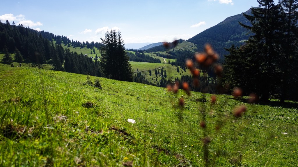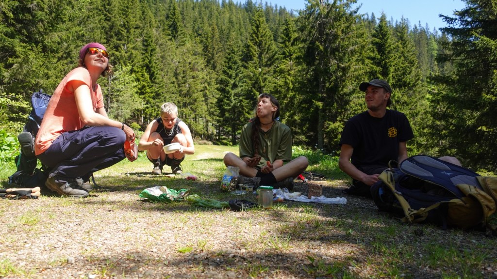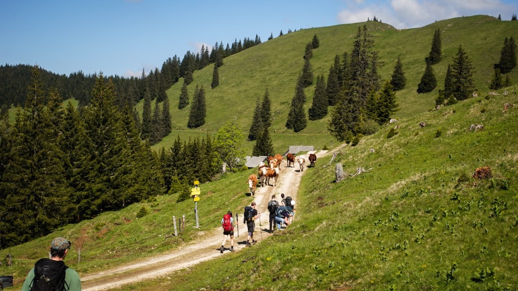 Über sanfte Almenwiesen und durch Wälder geht es allmählich immer wieder auf und ab. Gegen 11:00 Uhr legen wir eine Rast ein – mitten auf einer Forststraßenkreuzung. Was mir auffällt: Einige aus der Gruppe haben ganze Brote mitgenommen, tragen seit gestern schon verpackten Käse mit sich herum. In Selmas Seitentasche steckt eine große grüne Gurke und mehrere Karotten. Ordentlich Proviant haben sie fast alle dabei, nicht zuletzt auch um sich das Frühstück auf den Hütten zu sparen. Ein Learning für mich: Frühstück kann, muss man aber nicht auf der Hütte nehmen.