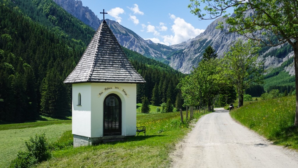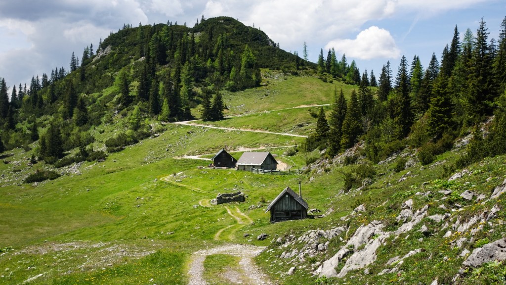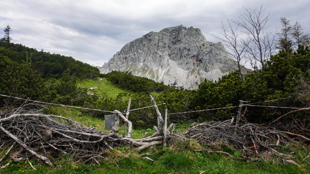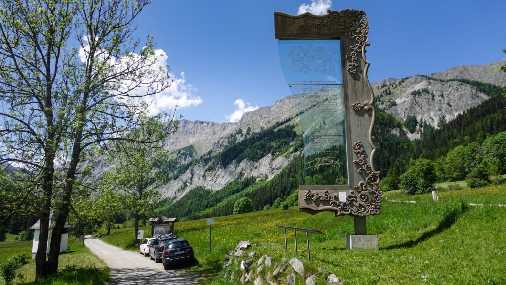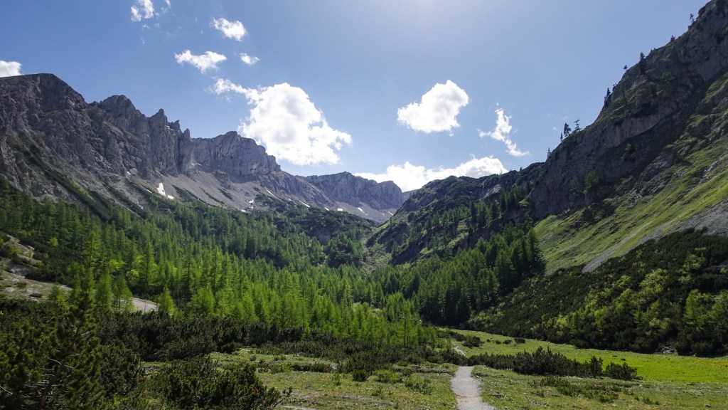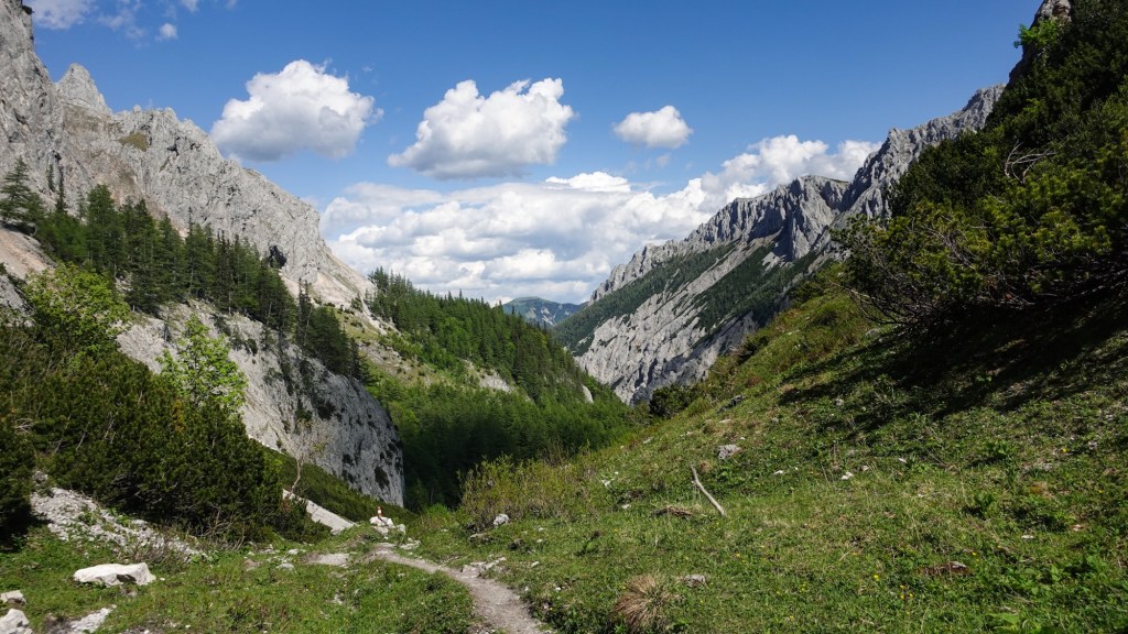 Nach der Rast geht es weiter in Richtung Seewiesen. An einer Alm machen wir noch eine kurze Rast. Ich trinke einen Almdudler, während die Gruppe über den weiteren Weg diskutiert. Schroff ragen die Kalkwände der Hochschwabgruppe westlich empor. Über sie führt binnen fünf Stunden einer der Wege zur Voisthalerhütte. Der andere führt innerhalb von drei Stunden erst allmählich und später steiler durch den Talboden hinauf. Die Zeitangaben zeigen zumindest einschlägige Wanderapps an.