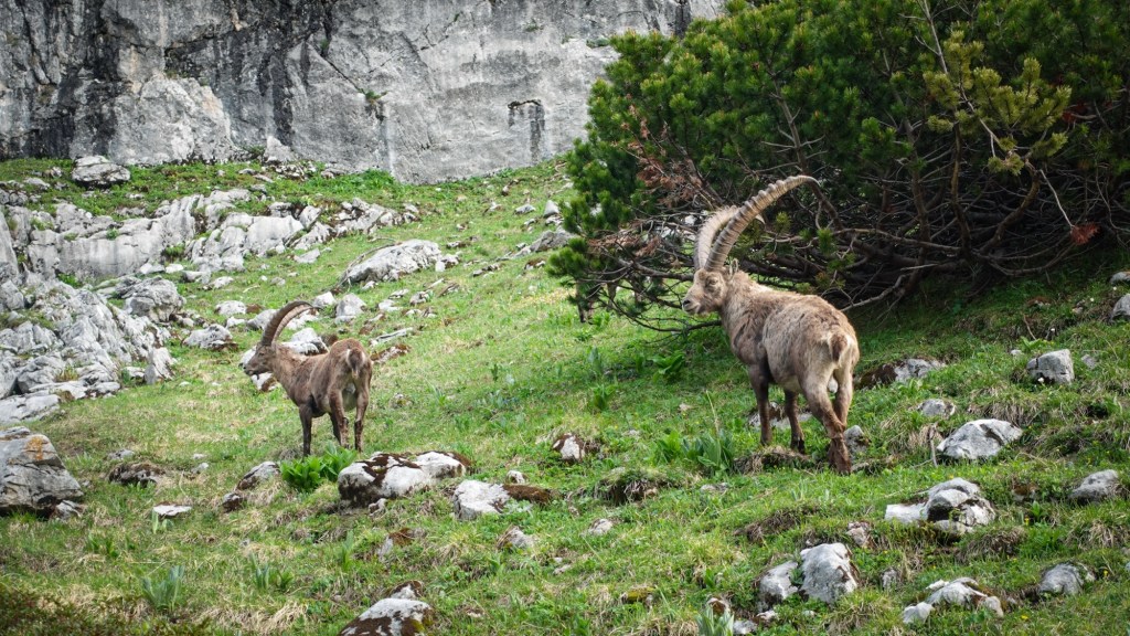 Während ein Großteil unserer Gruppe über einen Klettersteig zum Hochschwab aufsteigen möchte, entscheiden sich Moritz, Walter und ich für den „gemütlichen“ Wanderweg. Direkt hinter der Hütte können wir drei Steinböcke in der Ferne sehen. Wir freuen uns über diese seltene Begegnung nicht ahnend, dass wir gleich eine ganze Herde beinah schon von den Wegen schieben müssen. Zur Kaiserzeit waren diese imposanten Tiere in den Alpen eigentlich beinah ausgerottet. Später, dann wurden sie wieder gezielt angesiedelt. Die Scheu vor dem Menschen haben sie aber offenbar nie ganz zurückerlangt.