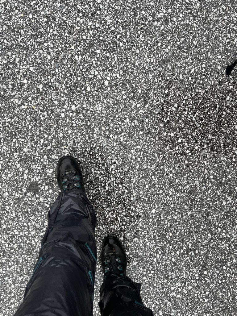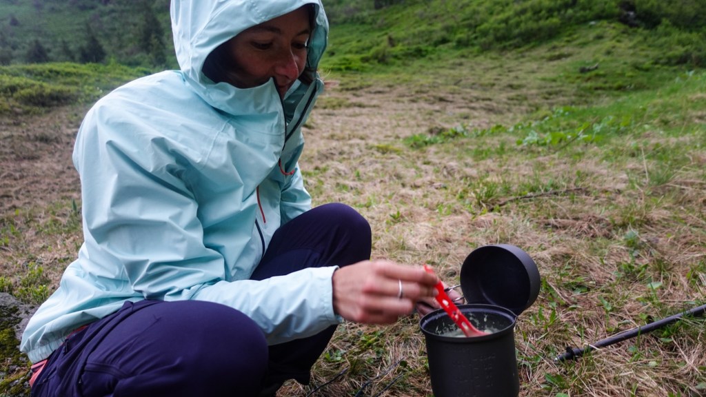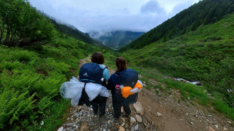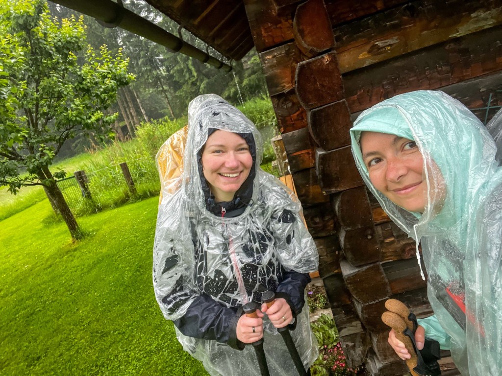 Und hier geht es los: Vorbereitung ist alles. Ich bin so dankbar, dass Julia die Packliste hatte und ich zumindest in diesem Punkt vorbereitet war. Der Regen auf der ersten Etappe konnte uns einfach nichts anhaben. Wir trabten den Berg hinauf – höher, weiter, noch höher und wieder weiter.