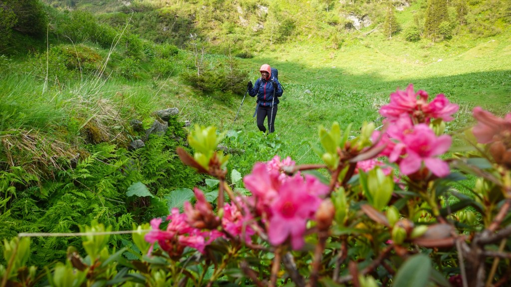 Schließlich schultern wir unsere Rucksäcke, verlassen das Gasthaus und pünktlich zum Aufbruch beginnt es zu regnen. Ungläubig fragt uns einer der Servicekräfte im Gasthaus, ob wir wirklich jetzt wandern gehen wollen. „Ja, klar! Es gibt kein schlechtes Wetter, sondern nur die falsche Kleidung,“ antworte ich.
