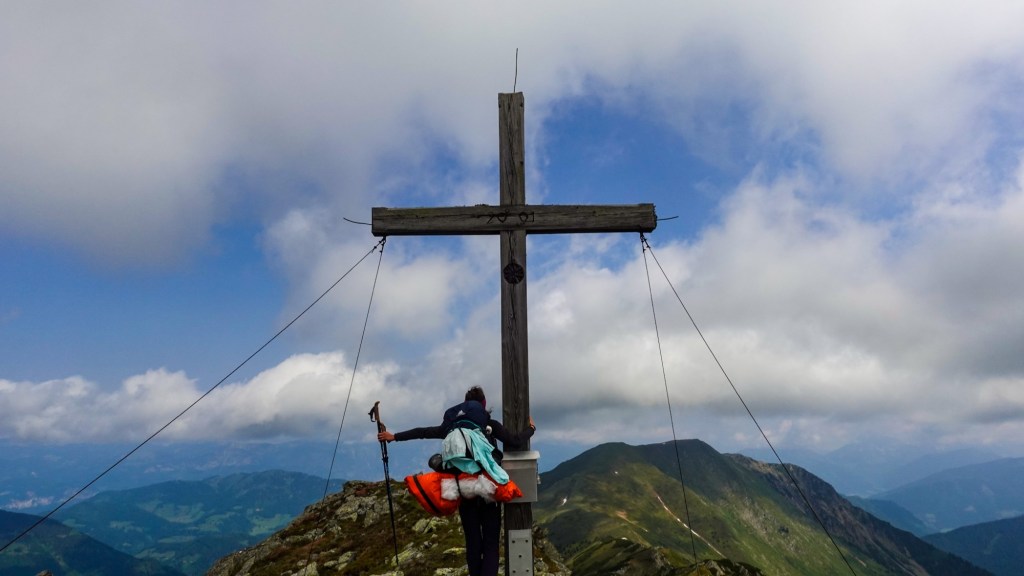 Neue Motivation, neues Hoch – obwohl wir uns geografisch betrachtet noch im Tal befanden. Also weiter „Schritt für Schritt“ war das Motto der gesamten Etappe. „Schritt für Schritt“ wie der Straßenkehrer bei Momo, sagte ich zu Julia und empfahl ihr das Buch. Da 500 Höhenmeter sehr lang und Wege auch richtig mies sein können, befand ich mich ab der Hälfte des letzten Aufstiegs wieder in einem Tief. Ich bin ständig stehen geblieben, weil alles schmerzte, zeitweise liefen verzweifelte Tränen. Endlich sah ich ein Schild. Dort oben an dem Wegweiser sollte dann der Aufstieg geschafft sein – so Julia. Ich weiß bis heute nicht, ob sie mich damit motivieren wollte oder ob es ihr selbst nicht bewusst war, dass wir an diesem Tag noch ein drittes Gipfelkreuz sehen würden. So sehr wie ich den Weg, die Etappe und die Sonne, die auf meine Haut prasselte, hasste, so sehr hat mich tatsächlich die Erkenntnis, dass wir bis zum Kreuz müssen, motiviert.