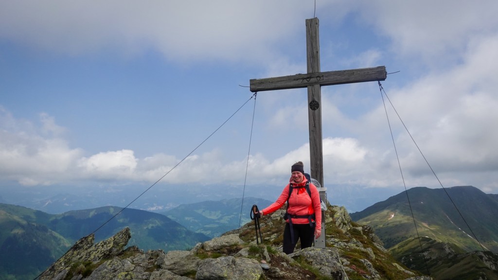 Zusammen mit Julia bei wunderschönem Wetter eine Aussicht zu genießen, die nicht schöner gemalt hätte sein können. Dieses Hoch hielt noch lange auf dem Kammweg an, der uns zum zweiten Gipfel führen sollte. Auf dem Gipfel angekommen, war ich wieder glücklich. Ich fühlte mich, als könne mir nichts und niemand etwas anhaben, weil ich es geschafft habe, zwei Gipfel zu erklimmen. In diesem Moment hörte ich eine Stimme: „Wir müssen uns jetzt ranhalten und gleich wieder los. Haben noch bisschen was vor uns und sind nicht ganz im Zeitplan.“