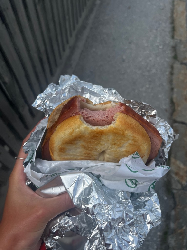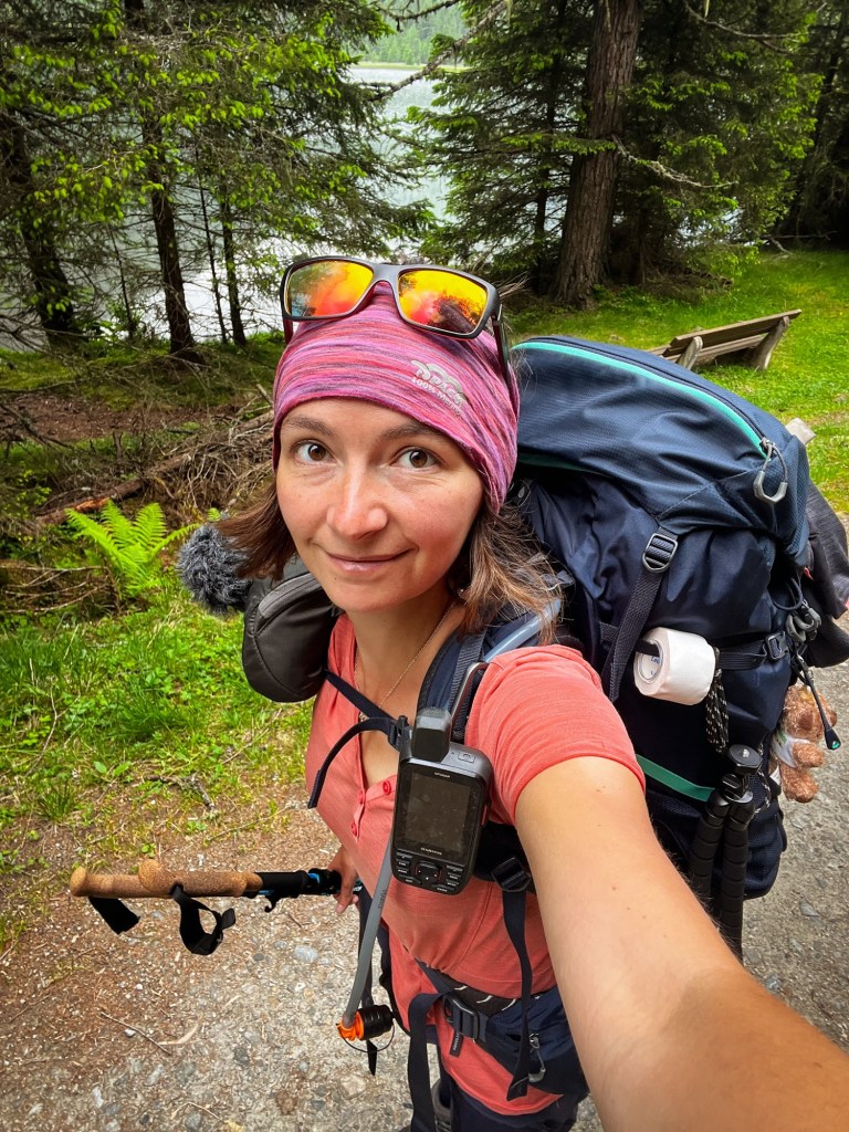 Mit den schrägen Blicken komme ich noch immer nicht so richtig klar. Ja, ich steh hier mit festen Bergstiefeln im Tal. Ja, ich habe einen großen Rucksack. Und ja, ich bin zu Fuß unterwegs. Porridge, Radler, Nudeln, Riegel, Schokolade, Pudding, Chips, Apfel und Pfirsiche finden ihren Weg in den Einkaufswagen. Oh, Leberkässemmeln im Angebot. Ich schlage zu. Magengrummeln stellt sich ein, nicht nur weil ich hungrig bin, sondern auch weil ich merke, dass es eine semi gute Idee ist, mit leerem Magen einkaufen zu gehen. Nicht zum ersten Mal mache ich diese Feststellung. All die Fressalien muss ich jetzt noch bis zum Campingplatz schleppen. Um Platz im Rucksack zu sparen, beginnt hinter der Kasse das große Auspacken. Pappkartons – weg. Plastikschalen – weg. Folie – weg. Seitdem ich wandere, wird mir immer bewusster, wie viel sinnlosen Müll unsere Zivilisation dem Planeten zumutet. Ein kleiner Berg türmt sich vor mir auf. Trotzdem passen die Einkäufe nicht vollständig in den Rucksack. Mit einer Papiertüte in der einen Hand und der Leberkässemmel in der anderen laufe ich die letzten drei Kilometer zum Campingplatz.