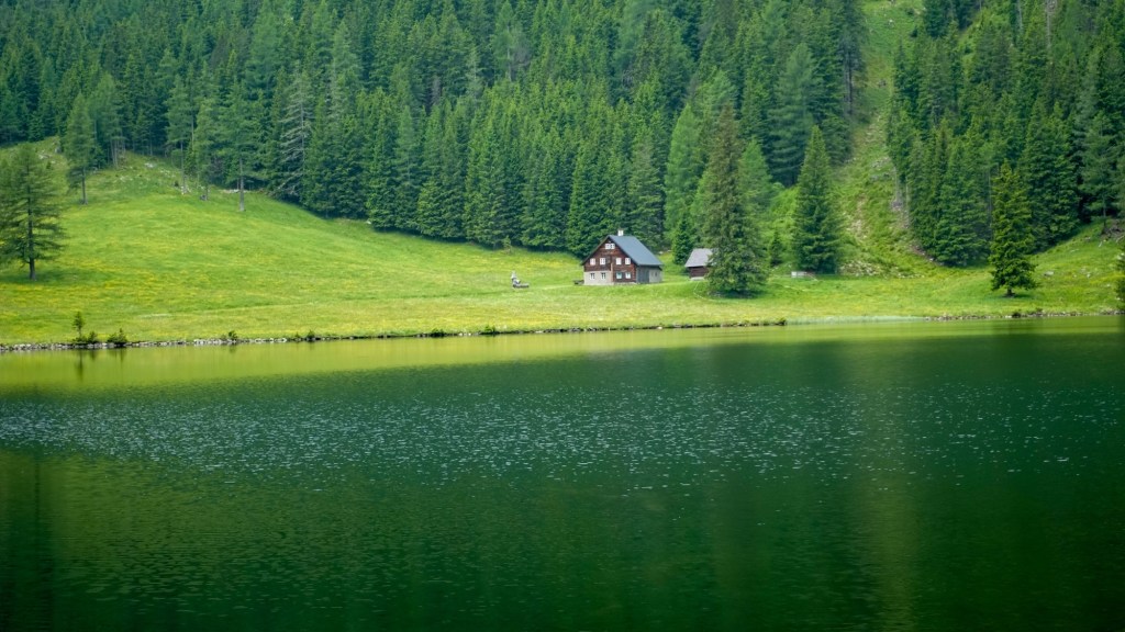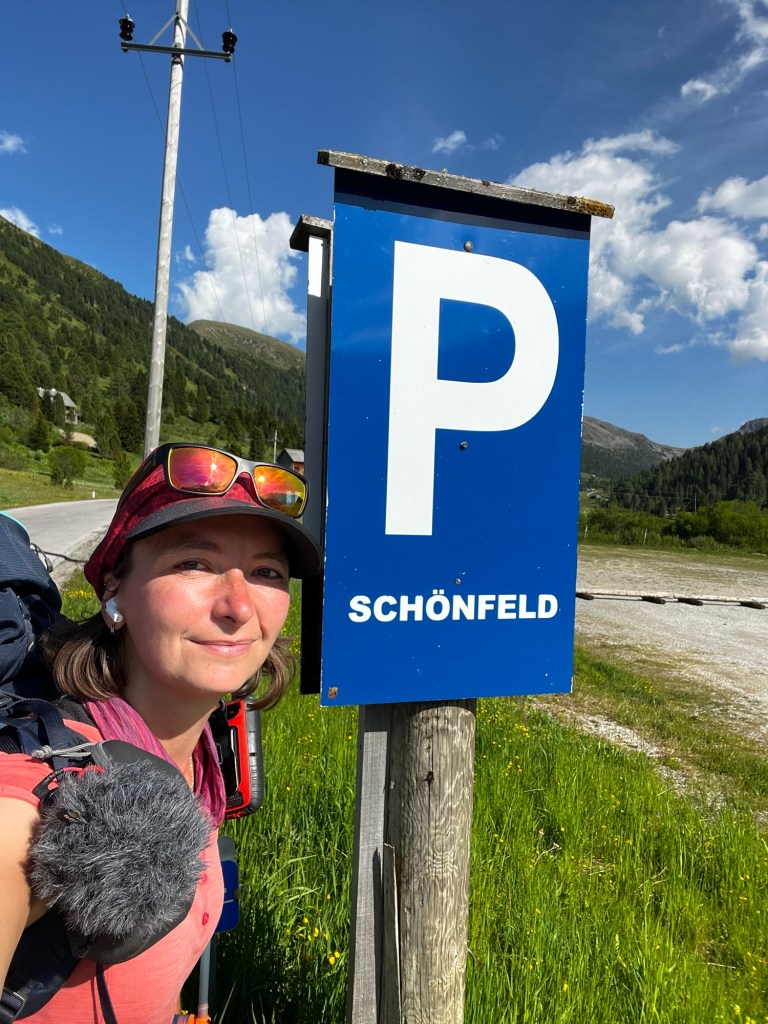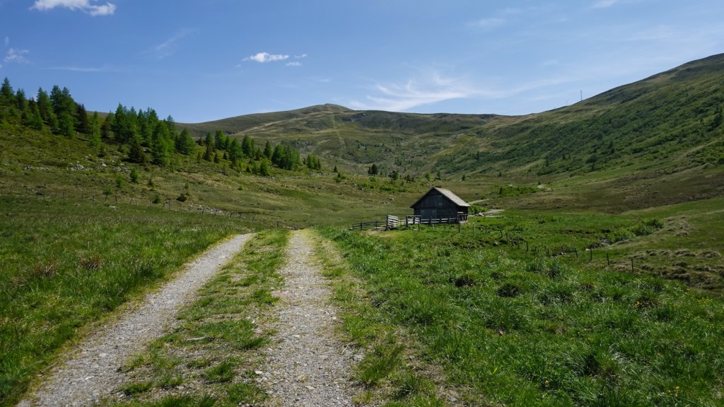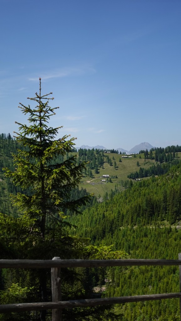 Bald schon wird aus dem Schotterweg wieder Asphalt. Doch die Baumgrenze rückt näher und gibt den Blick frei auf die umliegenden Hänge. Hinter den sanft grünen Hügeln luken die Spitzen schroffer Bergketten hervor. Ich zücke mein Handy und bestimme die Gipfel. Hochgolling und der Hohe Dachstein grüßen aus der Ferne. Letztes Jahr noch war ich am Hohen Dachstein, freilich nicht ganz oben, aber der Anblick der Spitzen ist mir vertraut. Ich setze meinen Weg fort und erreiche das Bergdorf Karneralm.