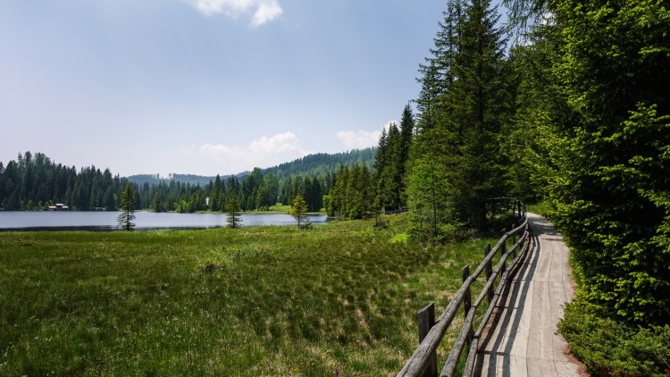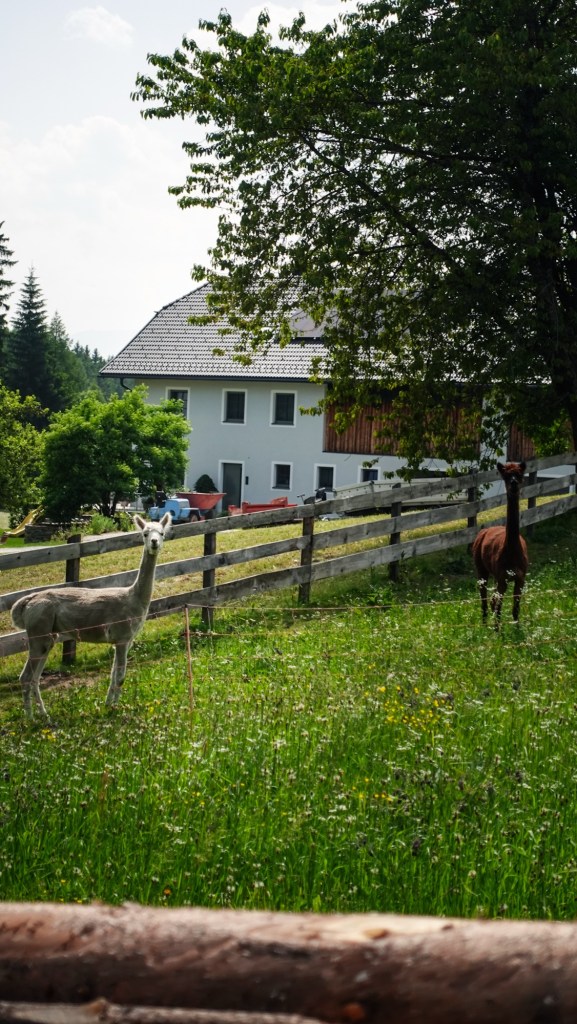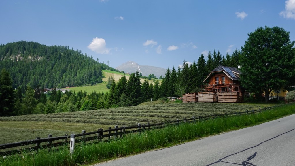 Rasch zieh ich mich bis auf die Unterwäsche aus und taste mich ins Wasser. Es ist kühl, aber bei Weitem nicht so kalt wie manch hoch gelegener Bergsee oder gar der Bach, in dem ich vor zwei Tagen gebadet habe. Am gegenüberliegenden Ufer kreischen Kinder aufgeregt durcheinander. Ich drehe meinen Kreis und schwimme zurück ans Ufer. Der Mann auf der Bank applaudiert, als ich aus dem Wasser steige. Gequält lächle ich. Unangenehm. Dann lasse ich mir noch ein paar Minuten die Sonne ins Gesicht scheinen. Jetzt aber weiter. Es folgen weitere elende Asphaltkilometer vorbei an vielen kleinen Höfen. Auf einer Weide stehen Alpakas. Es durftet nach frisch gehauenem Gras. Ein Bauer wendet mit seinem Traktor gerade den ersten Schnitt des Sommers. Im Westen erheben sich die Hohen Tauern. Südliche liegen sanft und hügelig die Nockberge vor mir. Morgen werde ich sie betreten. Jetzt aber führt mich der Weg erst einmal in den örtlichen Supermarkt.