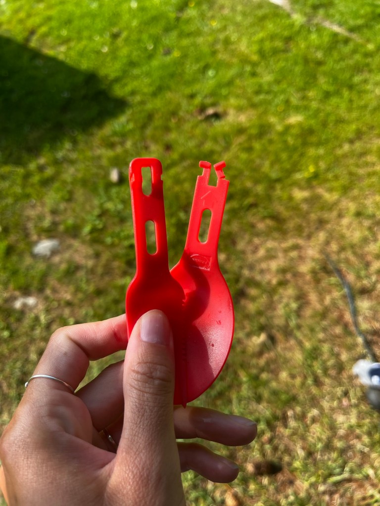 Die Nacht ist unruhig und der Morgen kommt viel zu früh. Eine lange Etappe steht an und so pelle ich mich 6.15 Uhr aus meinem Zelt. Kondenswasser tropft mir ins Gesicht. Super. Die Plane ist klatschnass und mein Schlafsack feucht. Letzteren hänge ich zum Trocknen über eine Bank. Die Zeltplane spanne ich locker über einen alten Sandkastenrahmen, der an einem Baum lehnt. Es ist der erste Morgen ohne Regen nach einer Zeltnacht. Was für ein Genuss. Jetzt Frühstück. Haferflocken in den Topf. Apfel hinzu. Milch obendrauf. Gaskartusche an. Nebenbei Fotos am Handy bearbeiten. Gestern Abend war ich dazu zu müde. Umrühren. Knack. Mist. Ich halte inne und den Göffel in zwei Händen. Das Klappscharnier ist ausgebrochen. Doch der Ärger währt nur kurz. Was hilft es und überhaupt – heute ist Freitag der 13. Wenn der abgebrochene Göffel mein Fail des Tages bleibt, komme ich ganz gut weg.