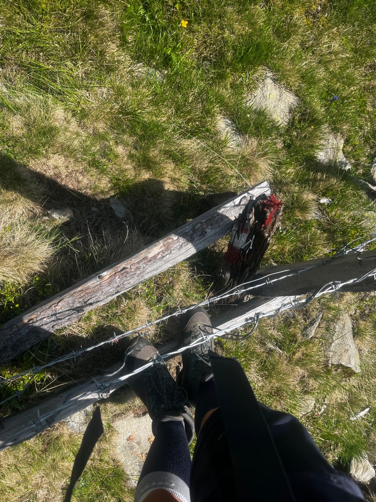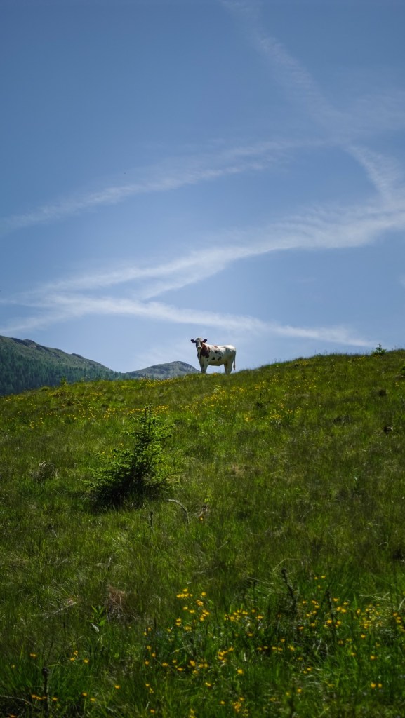 Durch ein großes Fernglas beobachtet Angelika Augenblicke später die gegenüberliegenden Hänge. „Gestern waren viele Gämsen unterwegs,“ erklärt sie kurz. Heute allerdings nicht. Heute ist es eine Kuh, die Angelikas Aufmerksamkeit auf sich zieht. Mit flottem Schritt trabt sie die Straße entlang, immer weiter Richtung Tal. Freiheitsdrang. Irgendwie kann ich sie verstehen – die Kuh. Immer das gleiche abgesteckte Wiesenstück kann langweilig werden. Du weißt heute, was übermorgen sein wird – nämlich das, was vorgestern schon war. Dabei lässt sich nur zu gut erahnen, dass es hinter dem dünnen Draht der Koppel mehr geben muss. Es braucht jedoch die Bereitschaft, den kurzen Stromschlag zu ertragen, den unangenehmen Moment auszuhalten, wenn die Komfortzone endet und das Leben beginnt.