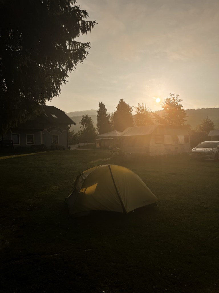 Freundlich werde ich von Angelika Santner, der Campingplatz-Chefin, begrüßt. Kurz kommen wir ins Gespräch über meine Tour. Dann baue ich hinter dem Campingplatzgebäude mein Zelt auf – das Einzige. Um mich herum stehen beinah ausschließlich Campervans, Wohnmobile und -anhänger. Hastig rühre ich mein Fertiggericht zusammen. Dazu gibt es ein Grapefruit-Radler.