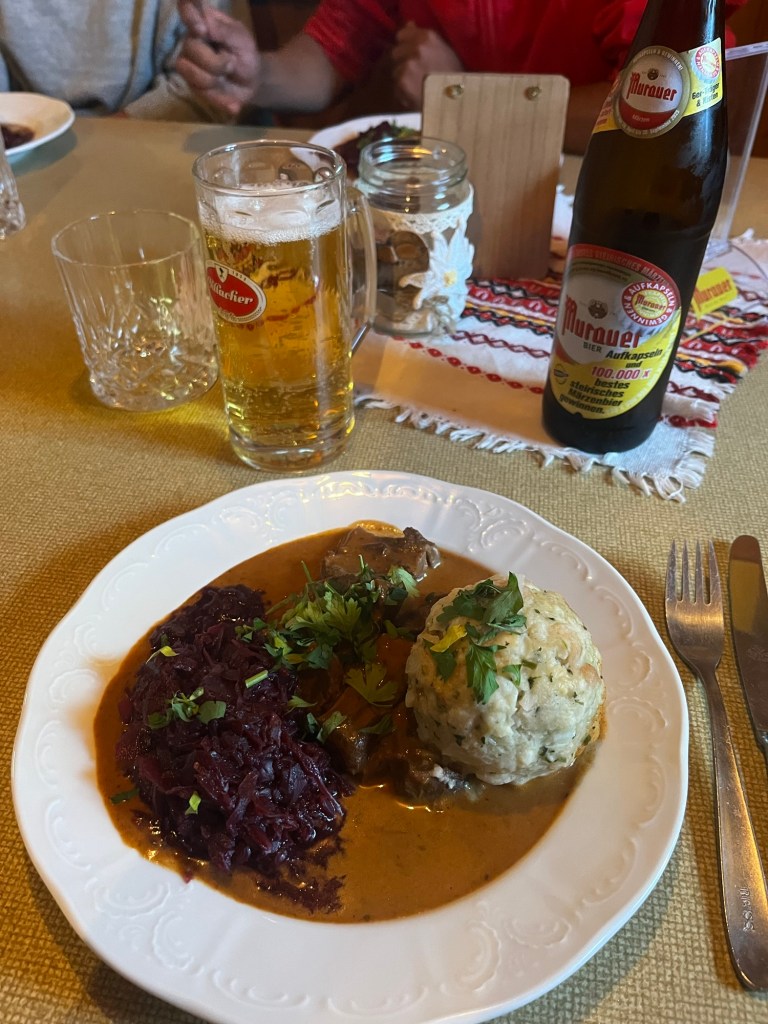 „Worauf habt ihr Lust heute Abend?“ fragt Andy und zählt die möglichen Gerichte, die er auftischen könnte, an der Hand ab. Verena und ich schauen uns an und gemeinsam mit Sabina und Passang fällt die Entscheidung auf Wildgulasch mit Rotkohl und Knödel. Dampfend stehen bald schon die Teller mit dem weihnachtlich anmutenden Essen vor uns. Es ist ein Gaumenschmaus.