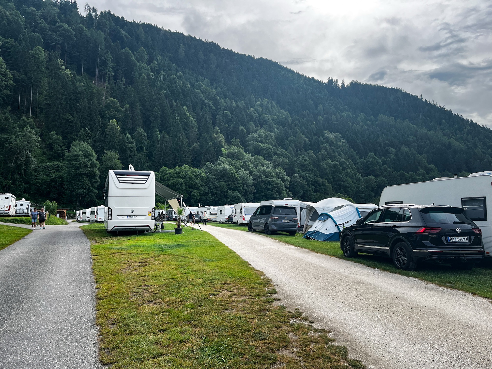 Mein heutiges Domizil ist der Campingplatz. An der Rezeption warte ich geduldig bis ich an der Reihe bin. Währenddessen vernehme ich Heimatklänge. In feinstem Sächsisch erklärt der Rezeptionist dem Gast vor mir, wo er den Stromanschluss seines Wohnwagens reparieren lassen kann. Ein wenig freue ich mich über den vertrauten Zungenschlag. Dann bin ich an der Reihe. „Ich würde gern für eine Nacht bleiben.“ – „Bloß eine Nacht? Wie groß ist das Fahrzeug?“ fragt der Rezeptionist. „Kein Auto. Ich bin zu Fuß auf einer Alpenüberquerung.“ – „Oh, wie lange dauert das denn?“ – „So ca. dreieinhalb Monate, wenn ich es schaffen sollte,“ antworte ich. „Aha. Na das muss man sich auch leisten können. Da könnte ich mir einen neuen Job suchen, wenn ich meinem Chef sage, ich bin dreieinhalb Monate weg,“ setzt er mürrisch in breitem Sächsisch fort. Die Schwingungen der latenten Unzufriedenheit liegen direkt in der Luft. Jetzt, weiß ich auch wieder, was ich an zu Hause nicht vermisse.