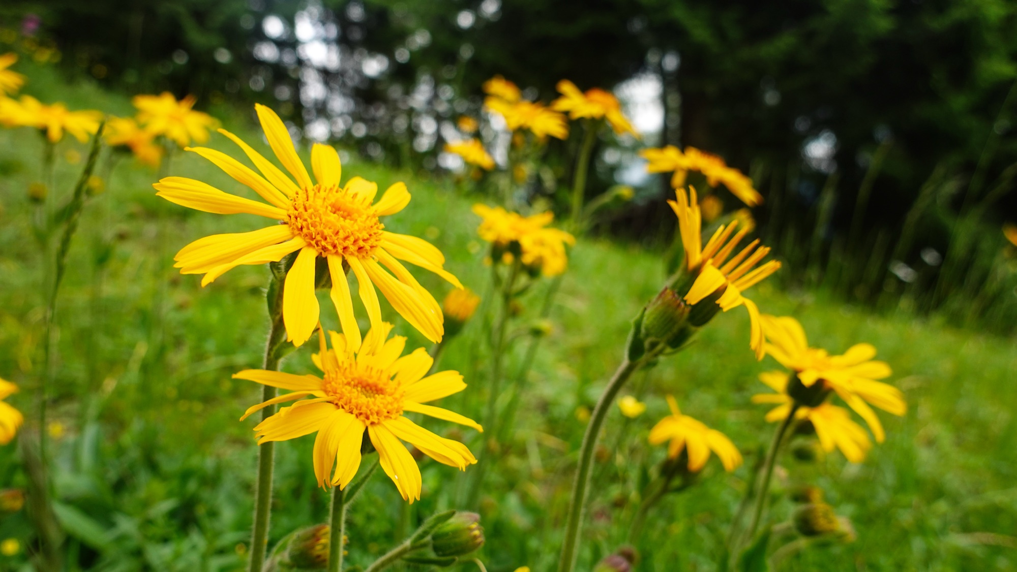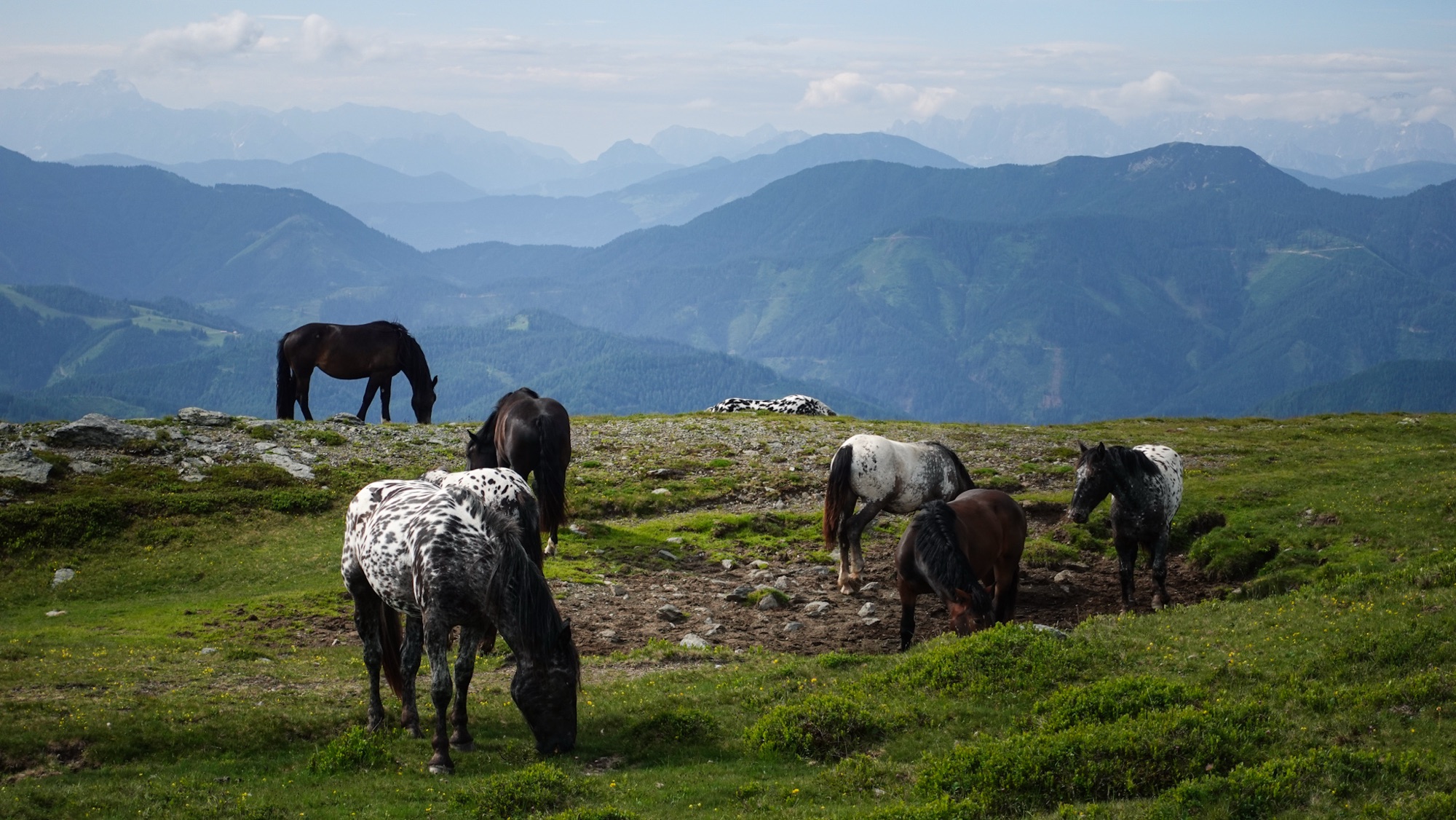 Als ich Gipfel Nummer eins, das Martenock erreiche, weht es mich beinah davon, so stark bläst der Wind über den Kamm. Ich genieße es, in diesem kleinen Sturm zu stehen. Zum ersten Mal sehe ich im Süden die Gipfel Italiens aufragen: den Jôf di Montasio, die Cima di Mezzo, die Creta di Rio Secco. Wow, einfach nur wow. Ich drehe mich herum, blicke gen Norden über das Drau-Tal und die zurückliegenden Berge, wie das Rosennock, den Eisenhut oder das Klomnock. Entlang des Gratweges setze ich meinen Weg auf das benachbarte Goldeck fort. Idyllisch ist es hier jedoch nicht. Das Gipfelkreuz wird von einer rot-weißen Antenne um ein Vielfaches überragt. Mehrere Liftstationen enden wenige Höhenmeter darunter. Zügig gehe ich weiter Richtung Südwesten durch lichte Lärchen- und Fichtenwälder.